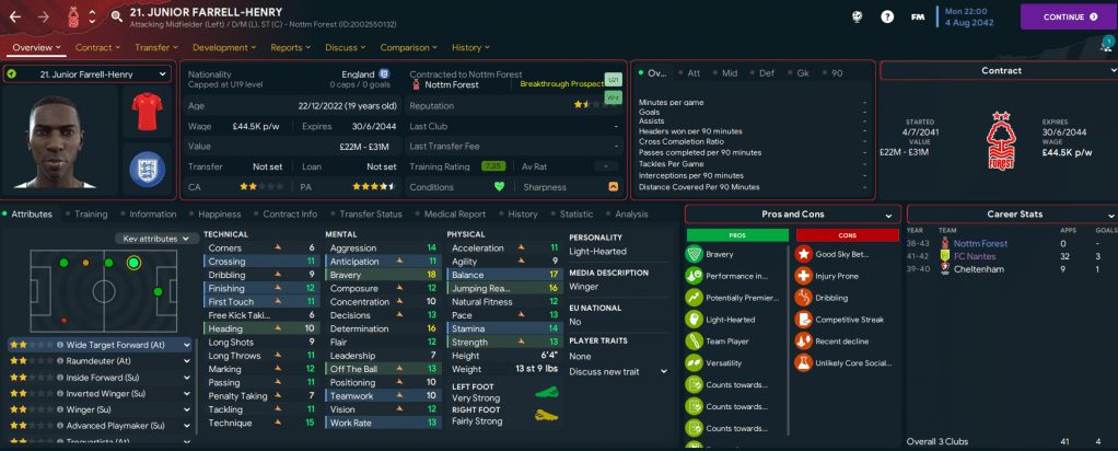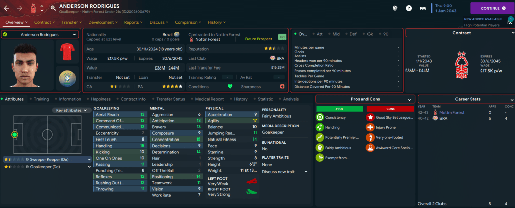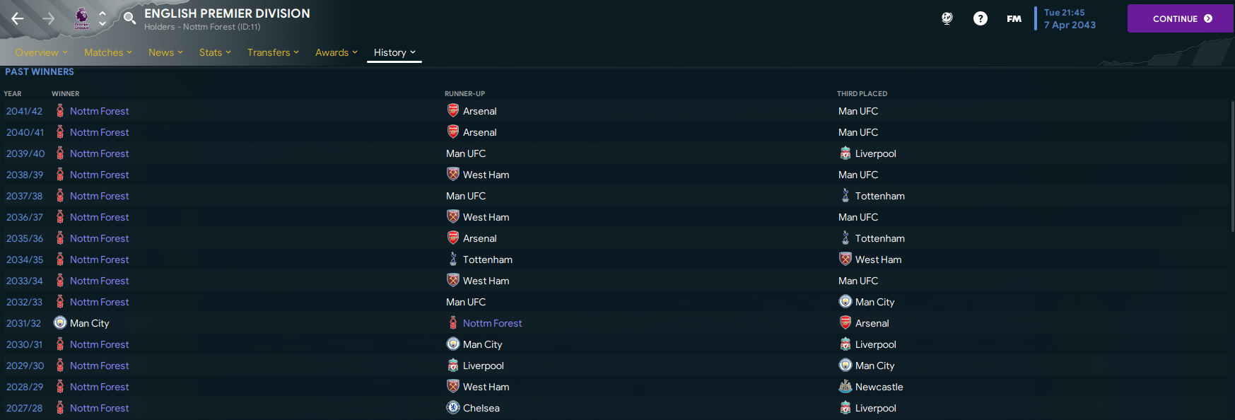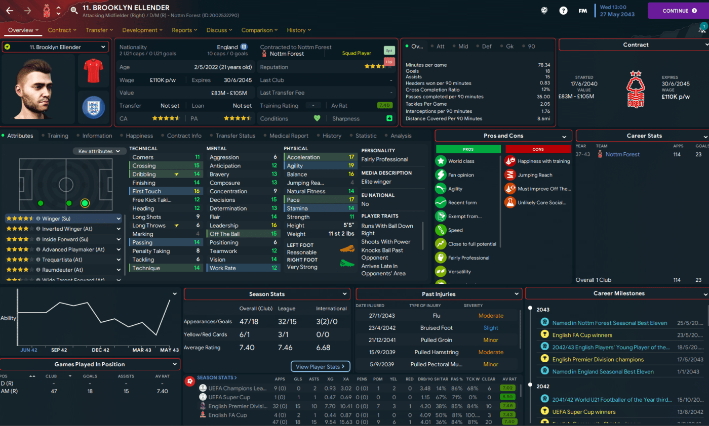 Sir Alex Ferguson’s impressive tally of 13 Premier League titles had been broken as we led Nottingham Forest to our 14th championship success in the 2041/42 campaign. I’d also racked up 5 Champions Leagues, 6 FA Cups and 4 Carabao Cups among my 47 trophies as a Football Manager. And, given the level of success, this could be the last season of this challenge with Forest.