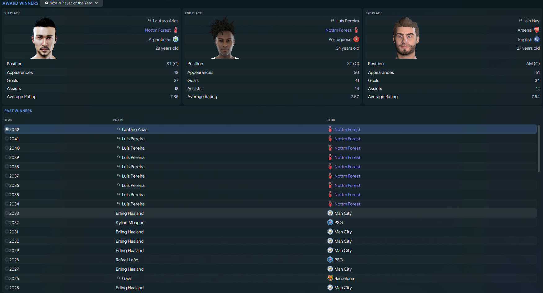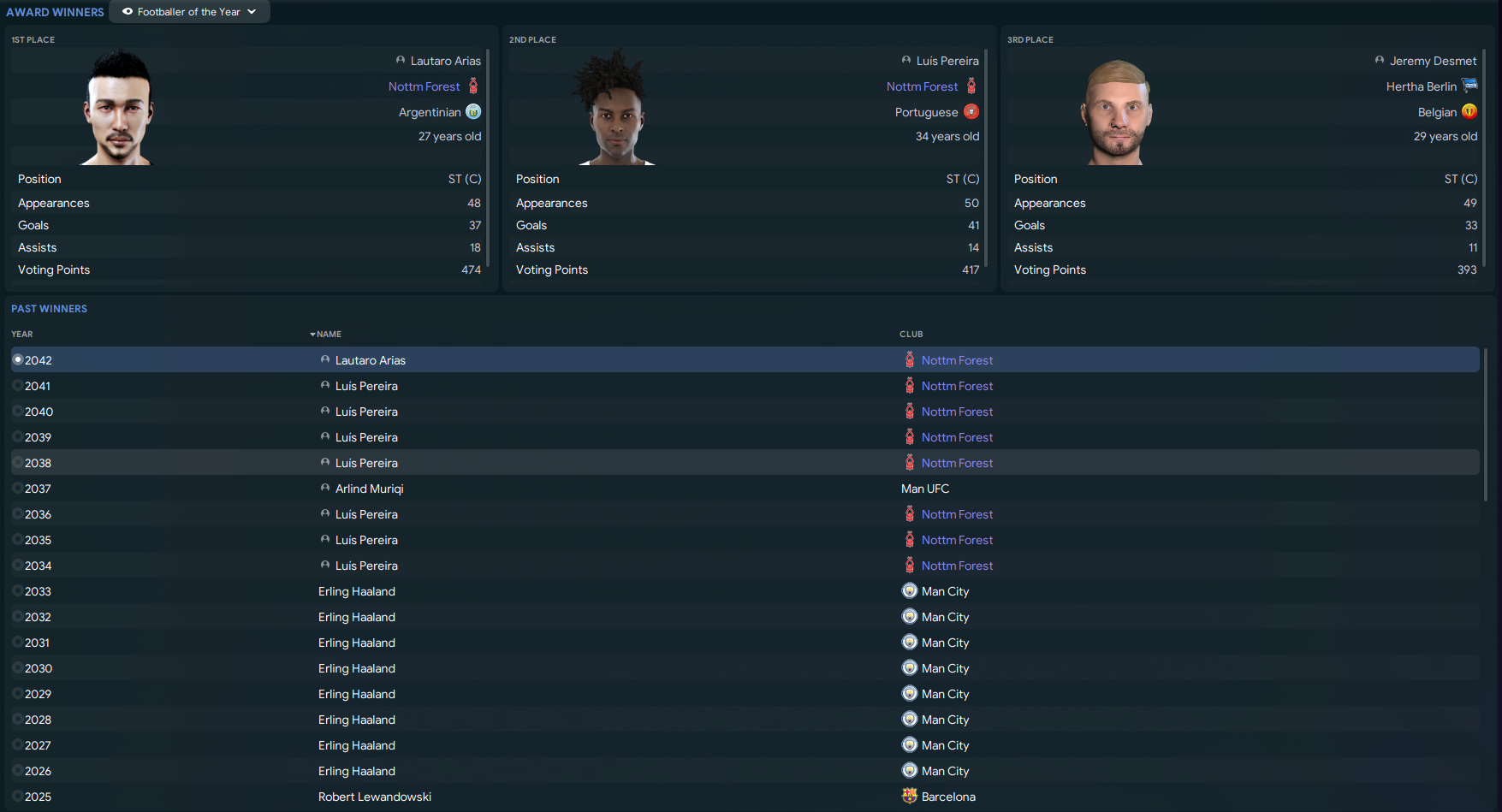 Arias was a surprise winner of the Ballon d’Or. He backed that up by winning Goal50 for the first time with Pereira in 4th then his first World Footballer of the Year and World Player of the Year awards, the latter of which Pereira had won 8 times in a row.