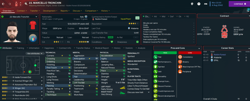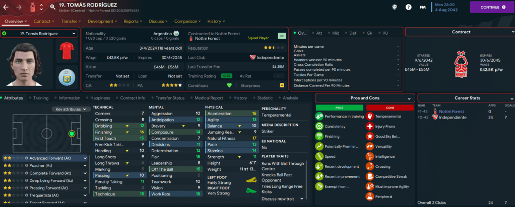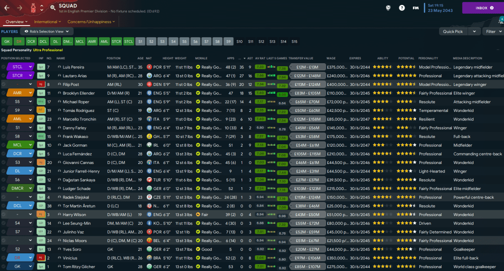 The summer of 2042 was one of change as several long-serving players announced they intended to leave. Winger Milo Bedini played 308 league games since signing from Madrid in 2031 but joined Spurs for £27m, midfielder Aymeric Vandendriessche played 328 league games since joining from Genk in 2032 and also joined Spurs for £20m and centre-back Jorge Pavas, now 33, made 462 league appearances since joining in 2026 but moved on to West Ham for £6m. We also sold homegrown midfielder Andrew Dorrian, who wasn’t developing very well, to Juventus for £35m.