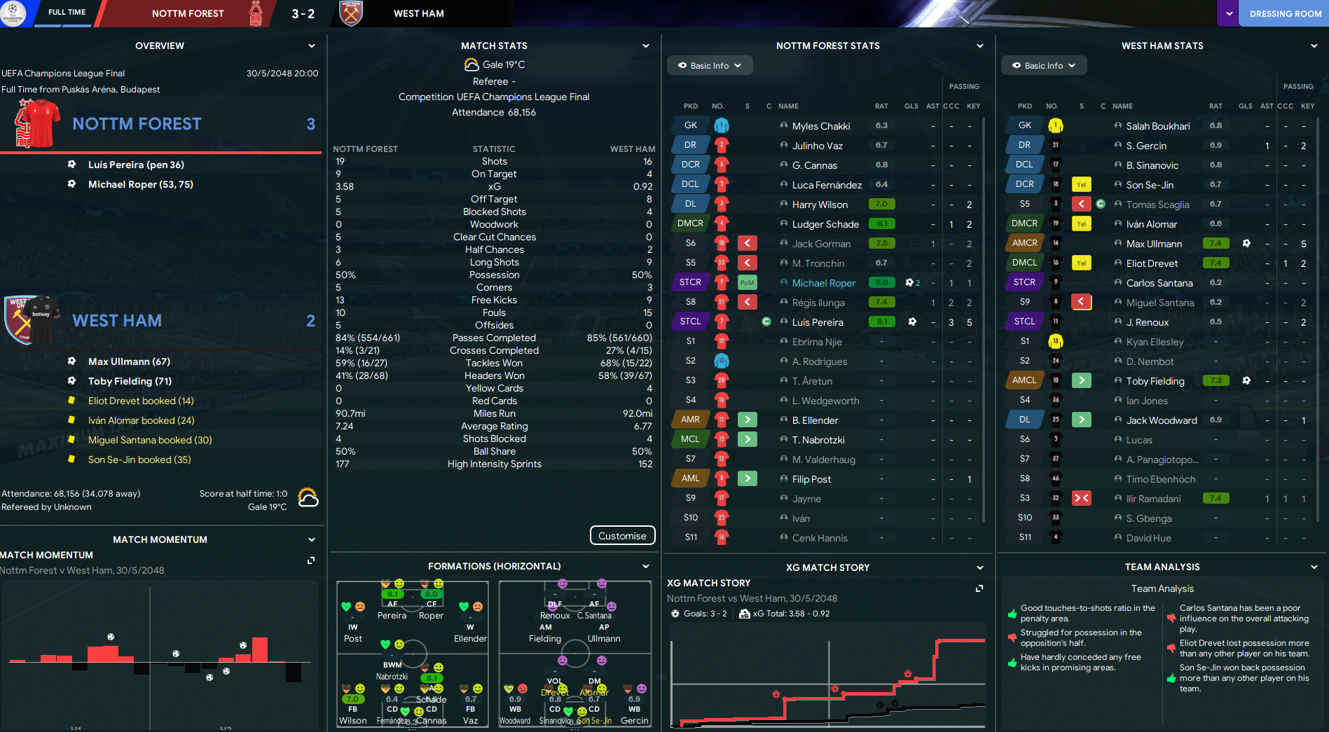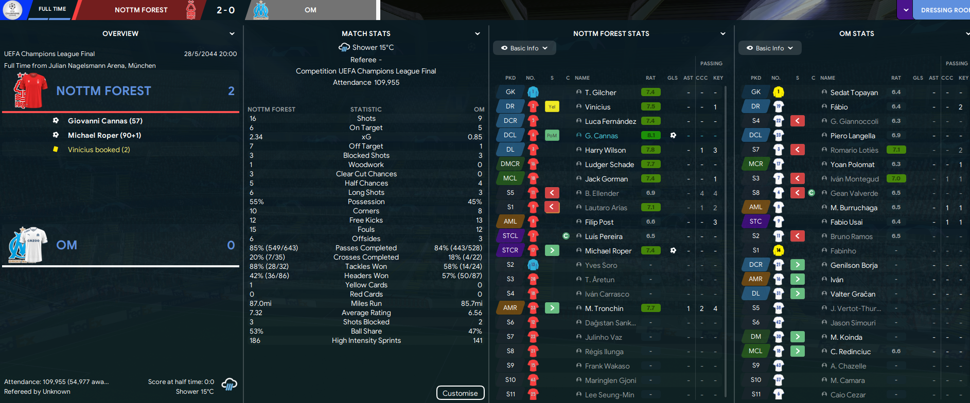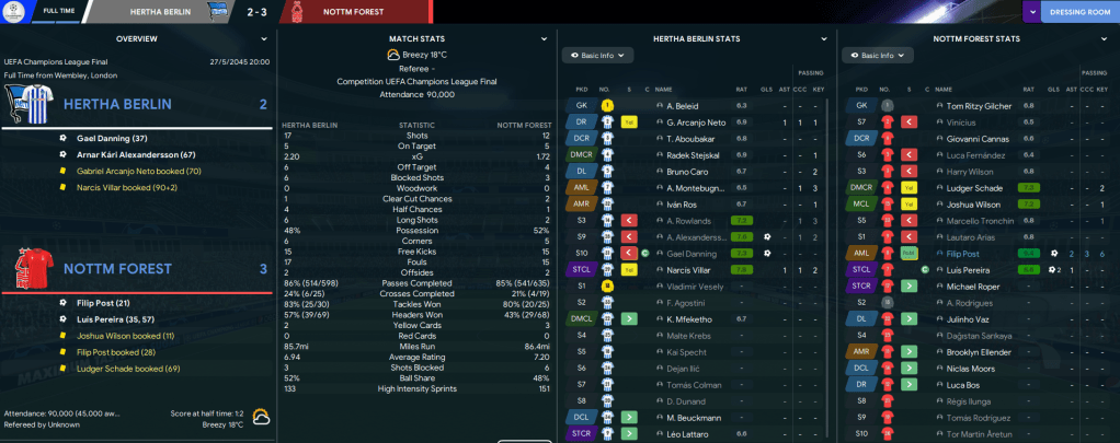 We beat Hertha 3-1 to tee up a Champions League Final against surprise opponent Marseille. The first half was dross so I upped the intensity homegrown striker Michael Roper wrapped up our 6th Champions League in 12 years. Pereira again topped our scoring charts with 44 in 55 plus 12 assists.