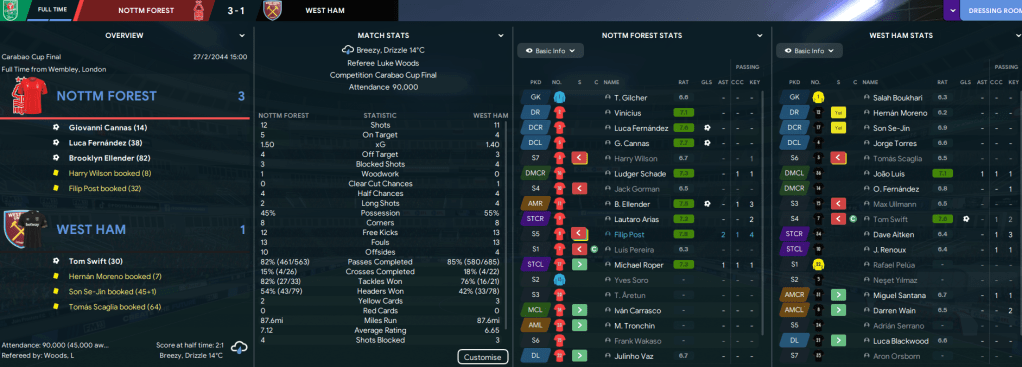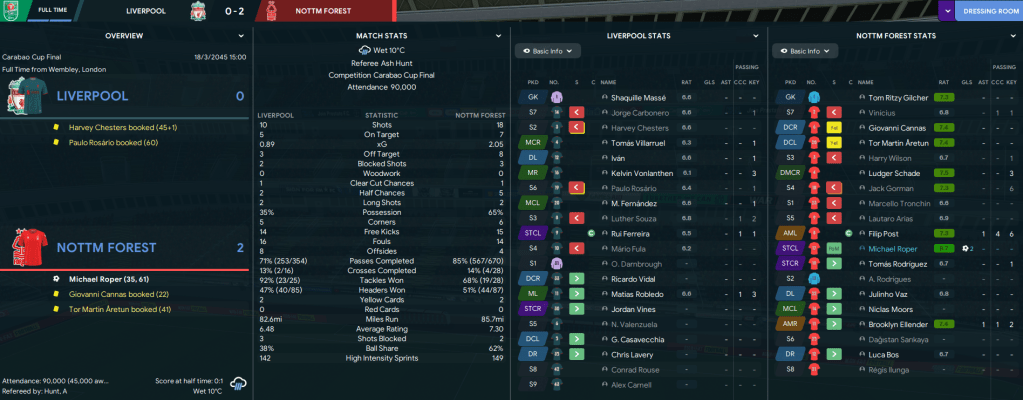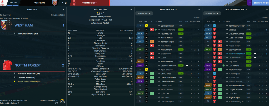 2043/44 began in style as Pereira’s brace led a 4-1 hammering of West Ham. He was in top form, including a brace in a 4-1 win over Bournemouth and a hat-trick to down Liverpool 3-0, which took him past 450 league goals for Forest. Our start was so good that, in late December, we broke the Forest record of 42 games without defeat, which had stood since 1978.