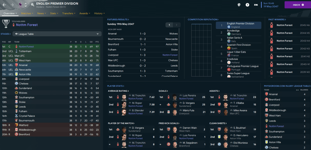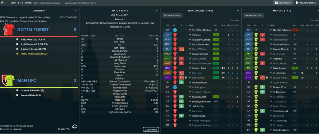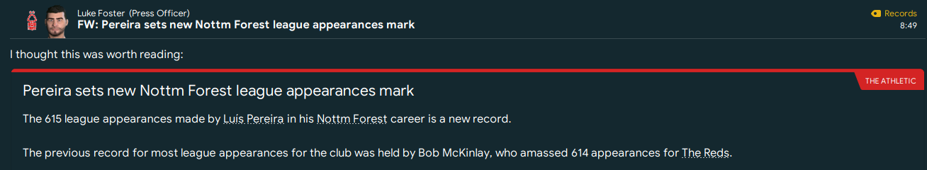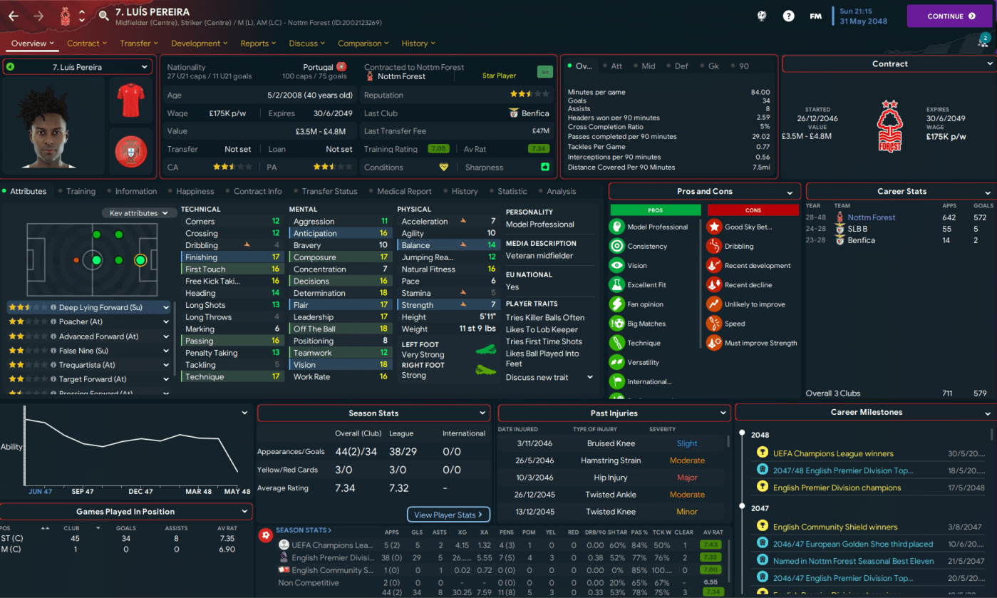 Pereira’s good form last season saw any thoughts of retirement well and truly off the table heading into 2047/48. And I, of course, kept on playing him in the league. He scored on the opening day as we won 2-1 at Villa and bagged a brace as we beat Bristol City 2-1 in our second home game. He fully cemented his Forest legacy as a brace in a 2-0 win over Chelsea took him past 550 league goals for the club then, a week later at Leeds, achieved something I didn’t think was possible as he surpassed Bob McKinlay’s record for the most league appearances for the club by moving onto an outrageous 615.