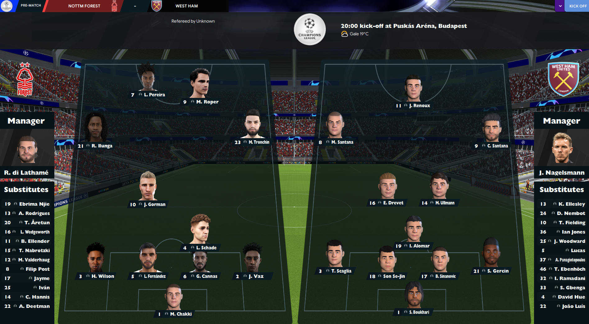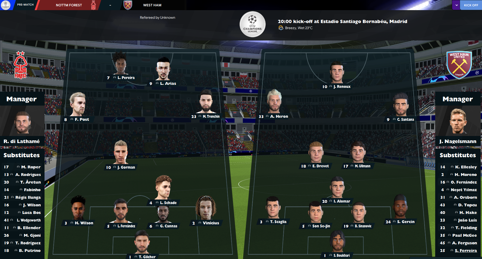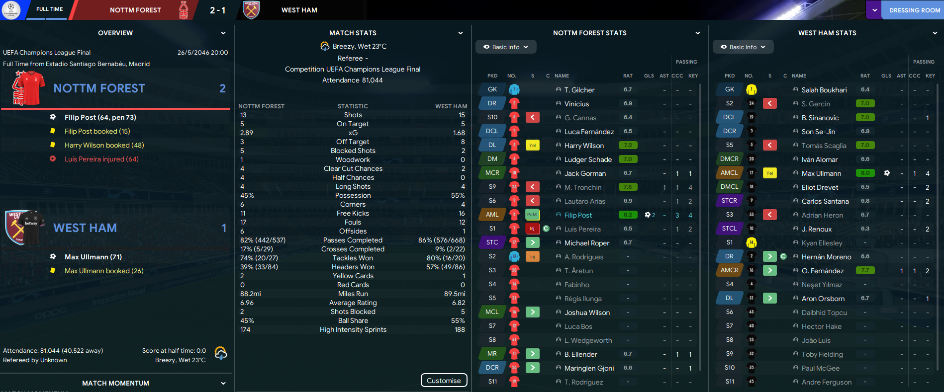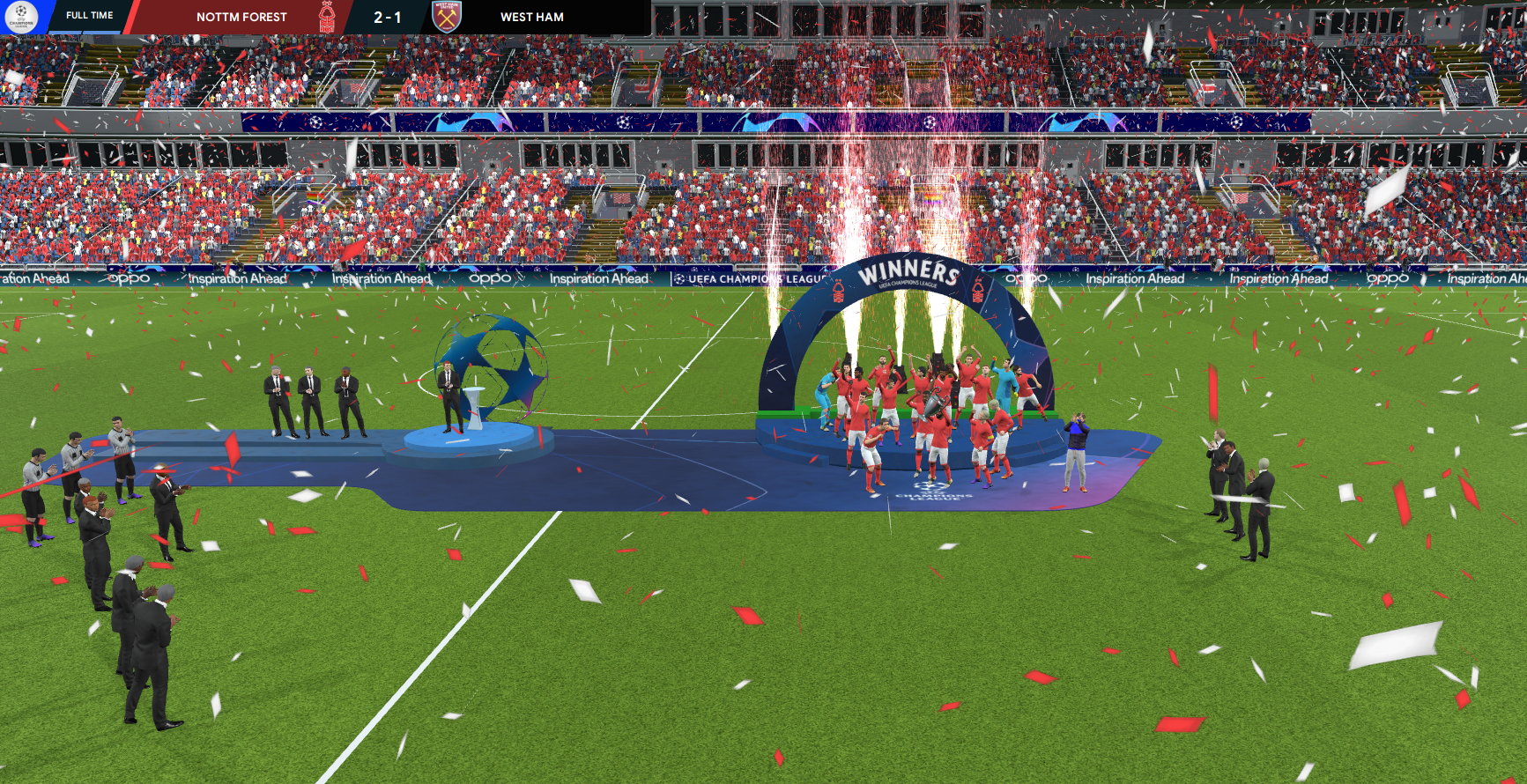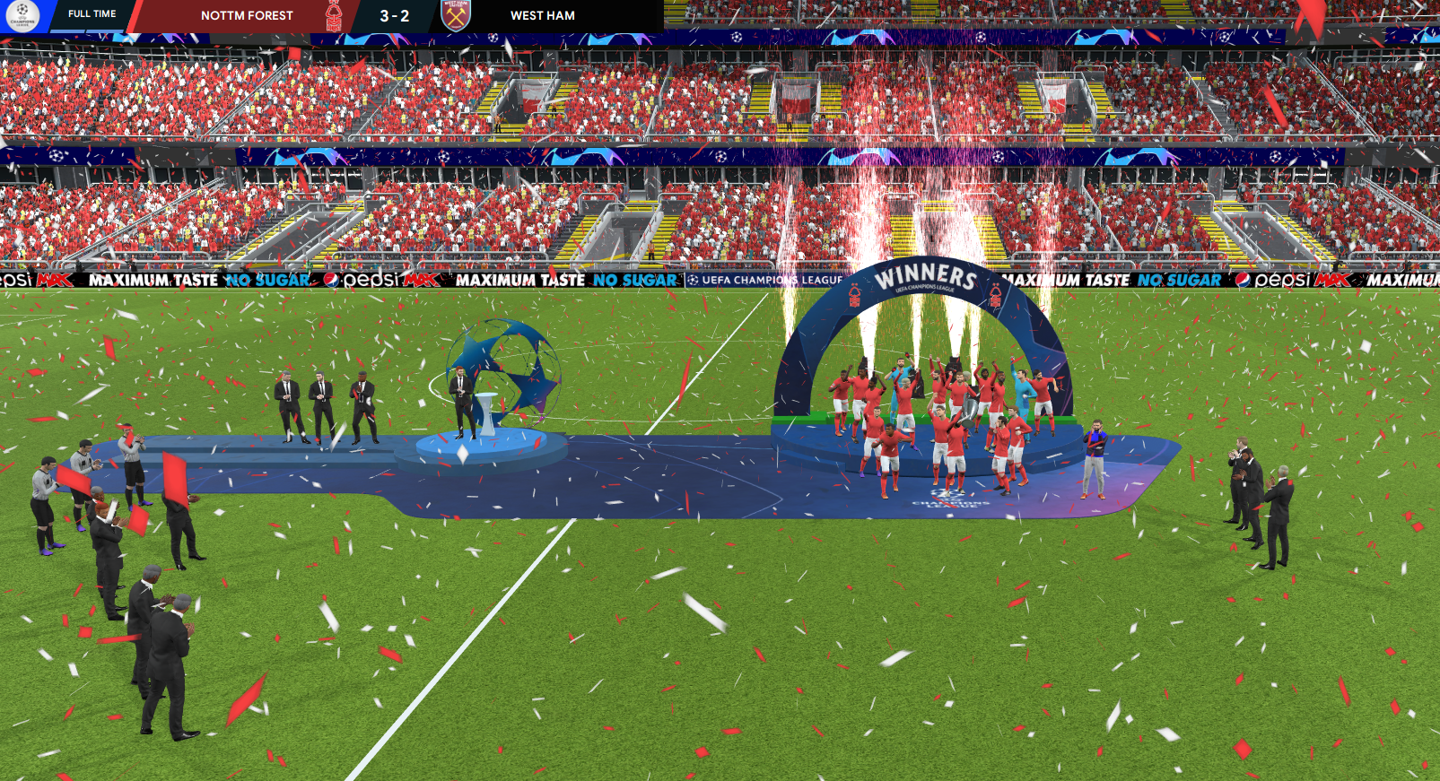 We breezed through the Champions League league phase then got a tough draw against Barca. However, we beat them 1-0 away and 6-0 at home led by Iluga’s 2 goals and 2 assists! It didn’t get easier as we took on Real but won a wild away leg 7-4 then drew 2-2 at home. And we made the final with a 5-3 aggregate win over Arsenal, with Pereira scoring in both legs after an injury crisis forced him into action. Another English team awaited in a repeat of the 2046 Final against West Ham, which was won by Roper as he won a penalty that Pereira converted then bagged a brace for a 3-2 victory.