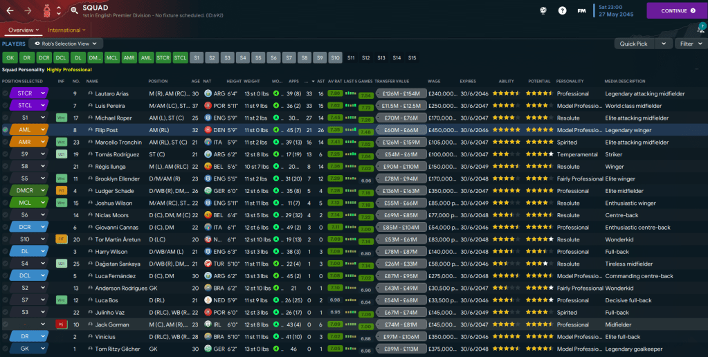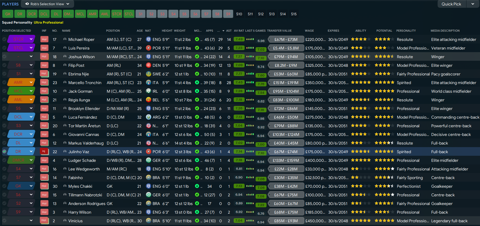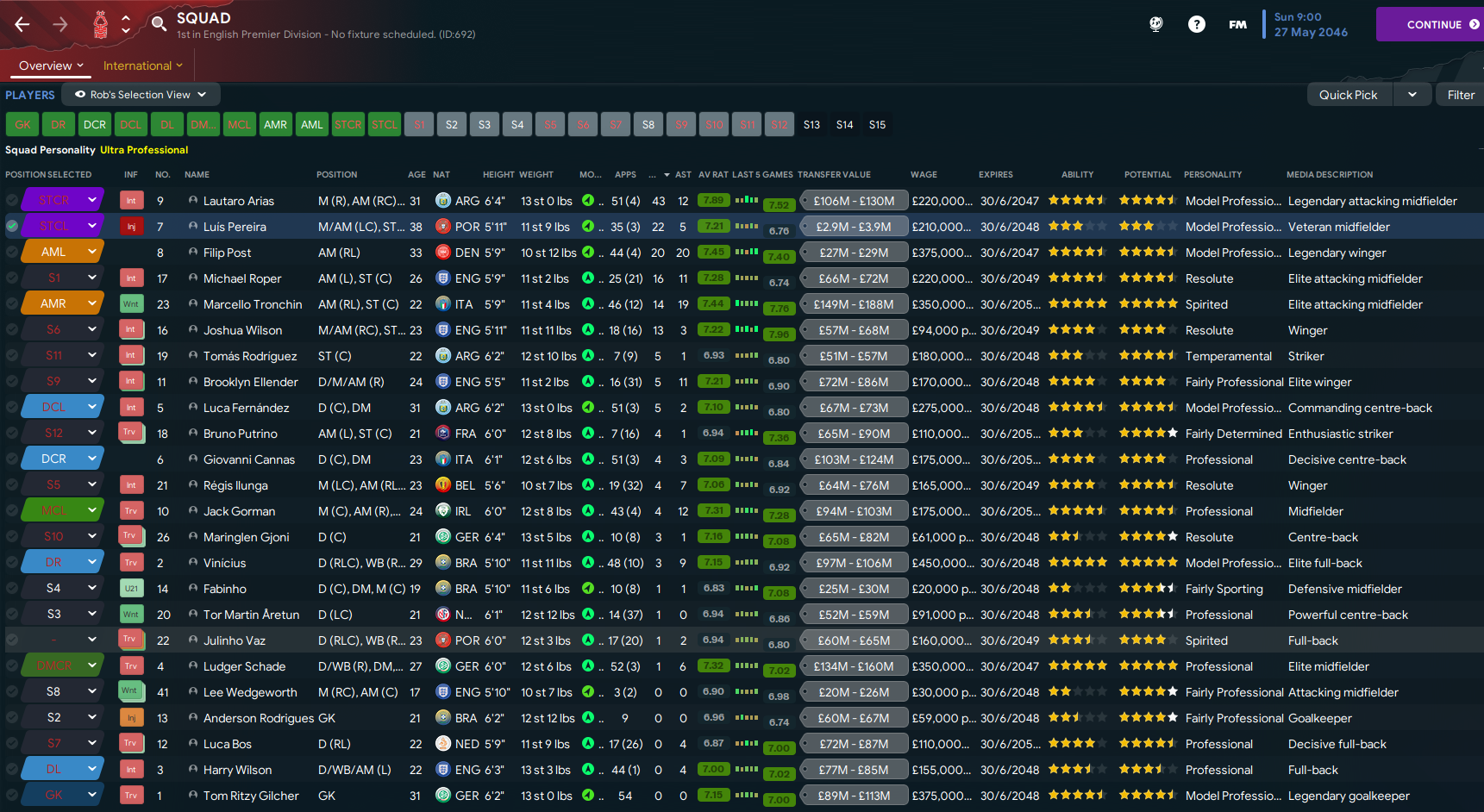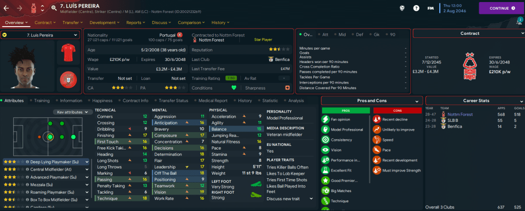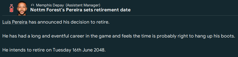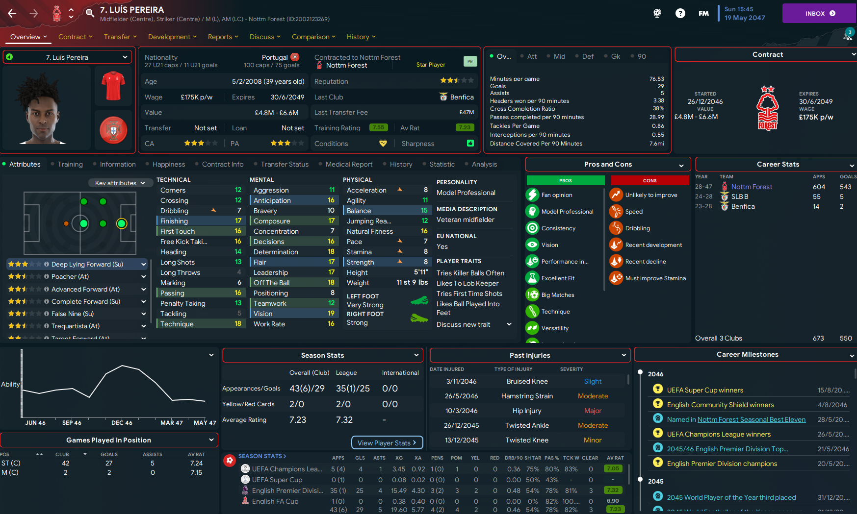 I presumed Pereira’s latest injury would prompt his retirement – but I was wrong, he was firmly committed to playing on in 2045/46. The only problem was his ability and physicals had declined massively over the last few months, to the point he’s now considered our 8th-best striker.