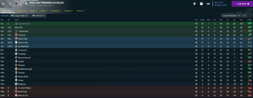 Our domestic domination continued by winning our opening 11 matches, including a 7-2 hammering of Liverpool, before a 2-1 loss at Spurs. And we walked to a 13th consecutive title, winning the league in mid-April before Pereira scored in a 5-2 win over Palace to move to 500 league goals for Forest. And we ended up with 103 points and 113 goals scored.