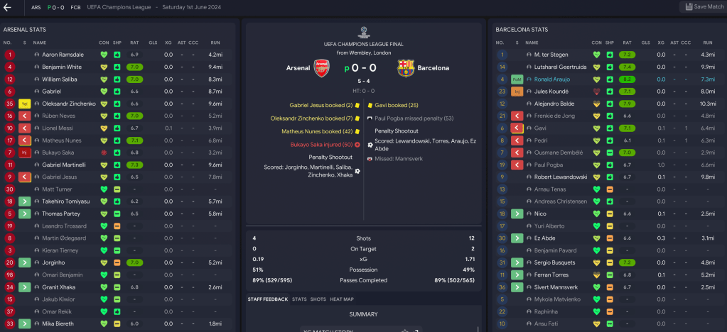 Messi also performed well in season 2 at Arsenal, as he dropped into a central midfield role but still delivered 9 goals, 6 assists and a 7.40 average rating in 29 league games and 14 goals, 7 assists and a 7.36 average rating in 44 games in all competitions. But he did miss 8 weeks of the season through injuries. Arsenal slipped to 3rd on 70 points, a huge 23 behind City. However, Messi’s presence delivered huge success as Arsenal won their first-ever Champions League by defeating Barcelona on penalties and won the FA Cup Final 2-1 against Chelsea.