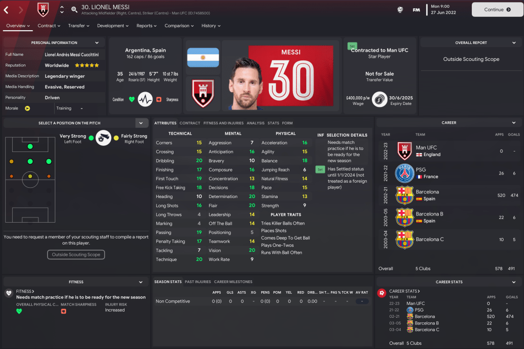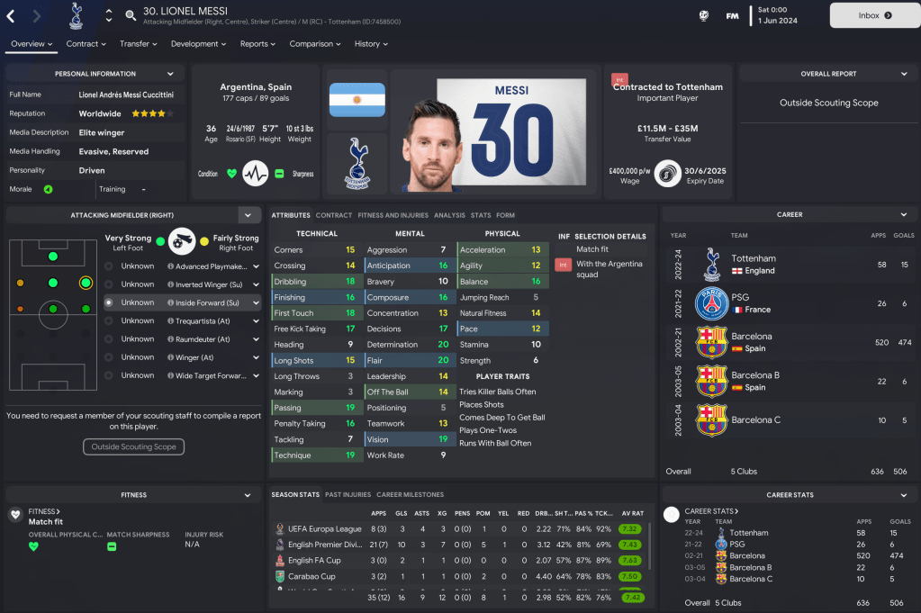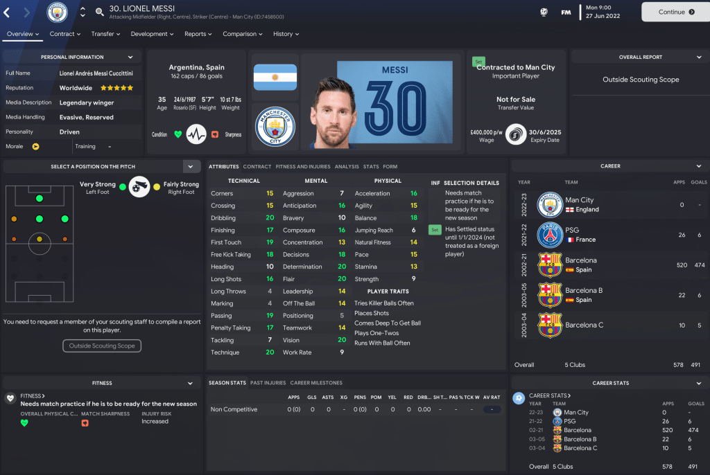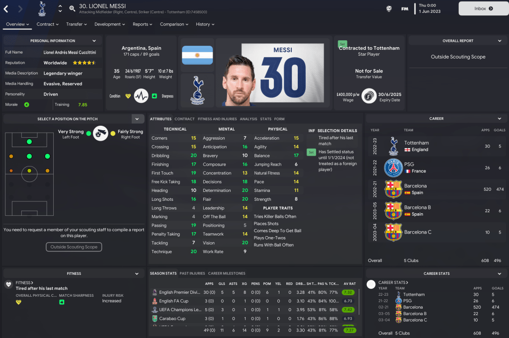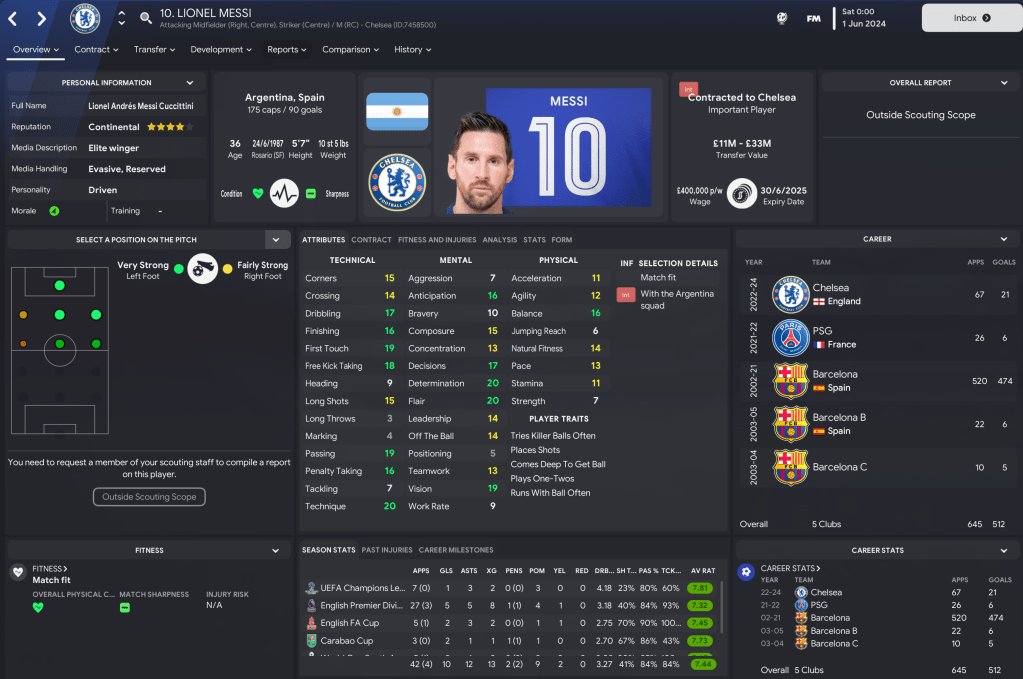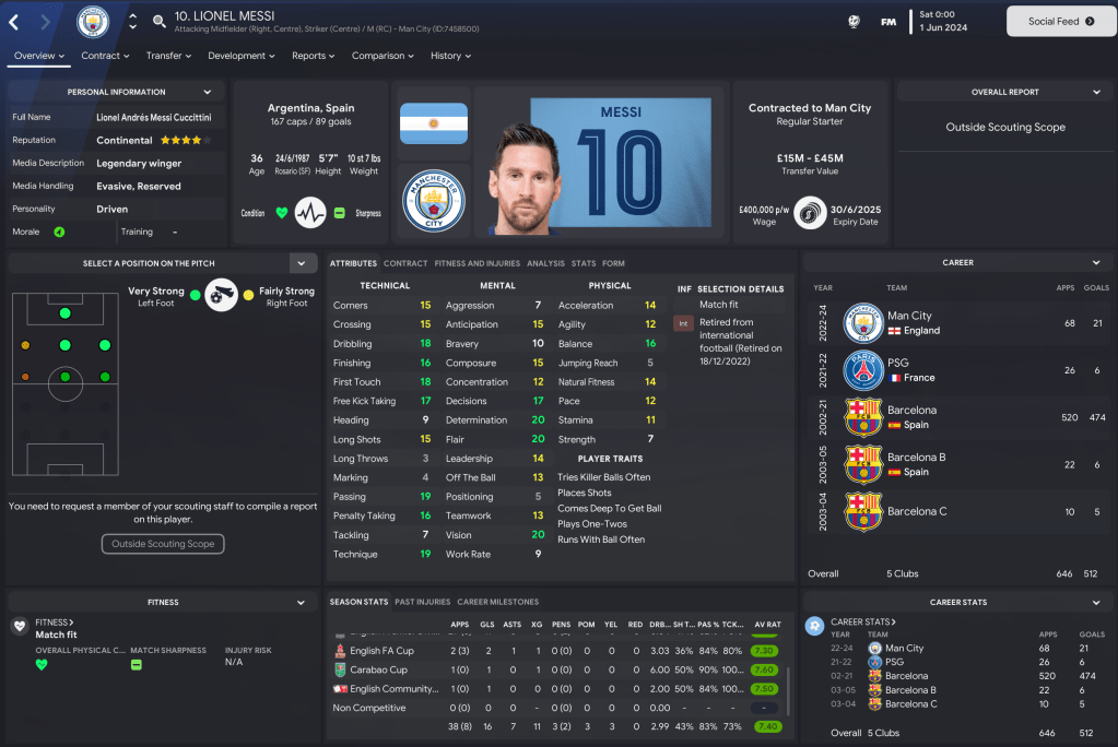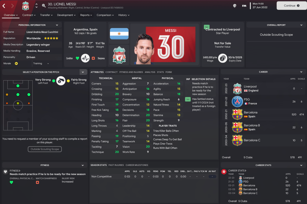 I used the FM Editor to create a mini-experiment with Messi transferring to every one of the Premier League’s 20 teams at the start of the 22/23 campaign. With each team, he had a 3-year deal worth £400k a week, down from his £575k a week at PSG. I started the game unemployed and holidayed ahead to the end of each of his seasons at all the Premier League clubs. So let’s see how he gets on in the Premier League!