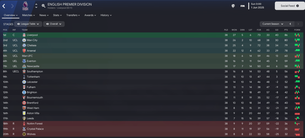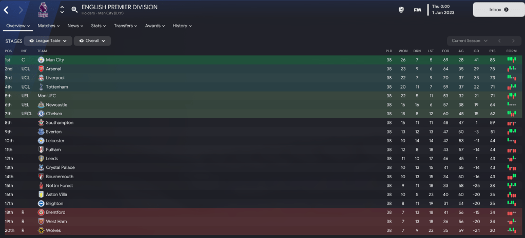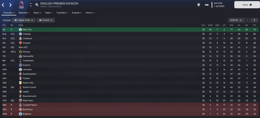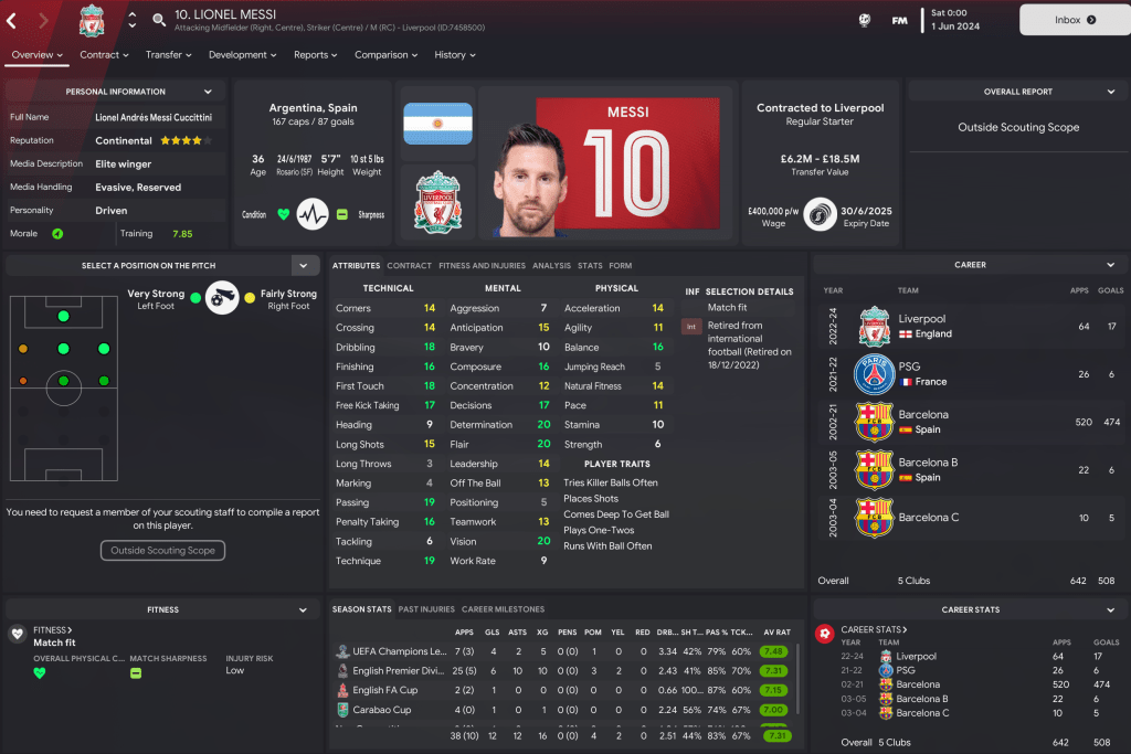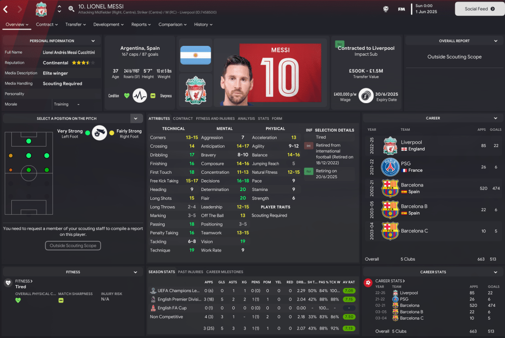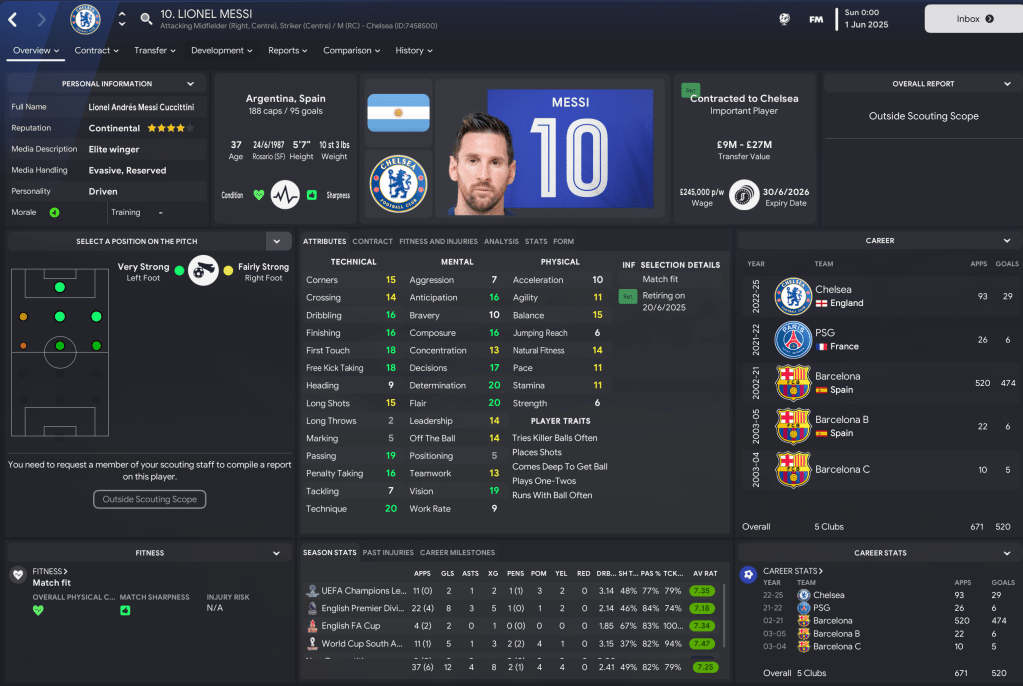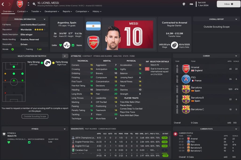 I used the FM Editor to create a mini-experiment with Messi transferring to every one of the Premier League’s 20 teams at the start of the 22/23 campaign. With each team, he had a 3-year deal worth £400k a week, down from his £575k a week at PSG. I started the game unemployed and holidayed ahead to the end of each of his seasons at all the Premier League clubs. So let’s see how he gets on in the Premier League!