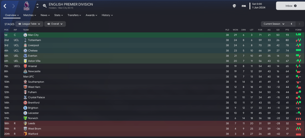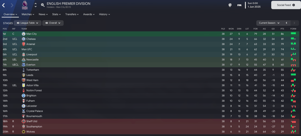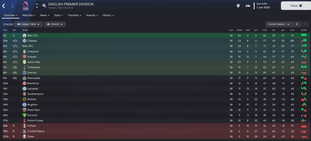 Messi’s first season in England was pretty successful as he scored 10 goals and got 8 assists with a 7.53 average rating in 34 league games. He also scored 18 and got 12 assists in all competitions. And his City side strolled to the league title with 91 points, 11 clear of Chelsea, winning 28 and losing just 3 times, as well as emulating real life by winning the Champions League with a 2-1 win over Real Madrid in the Final. However, there was no treble as they lost in the FA Cup semi-finals to eventual winners Nottingham Forest, who beat Everton in the Final.