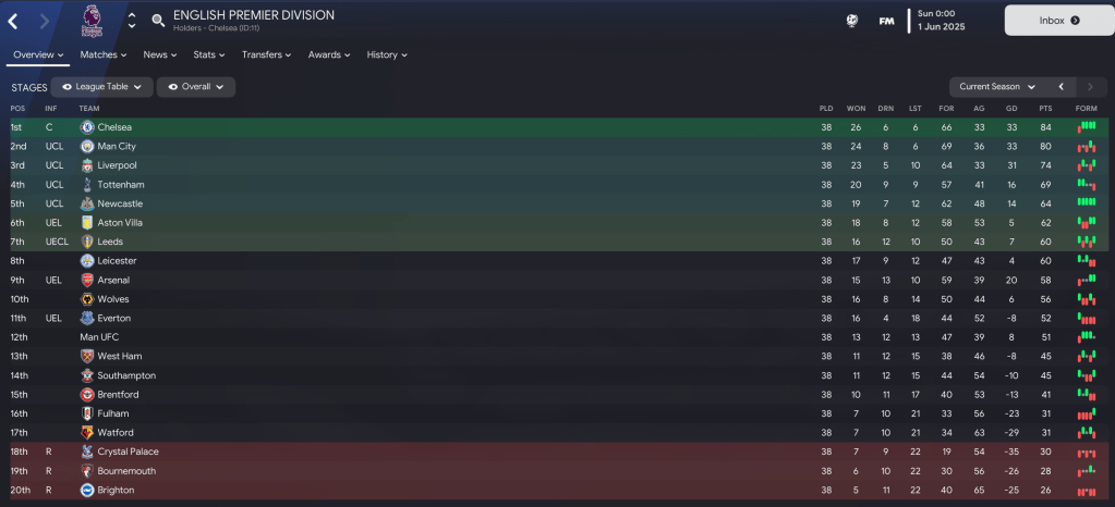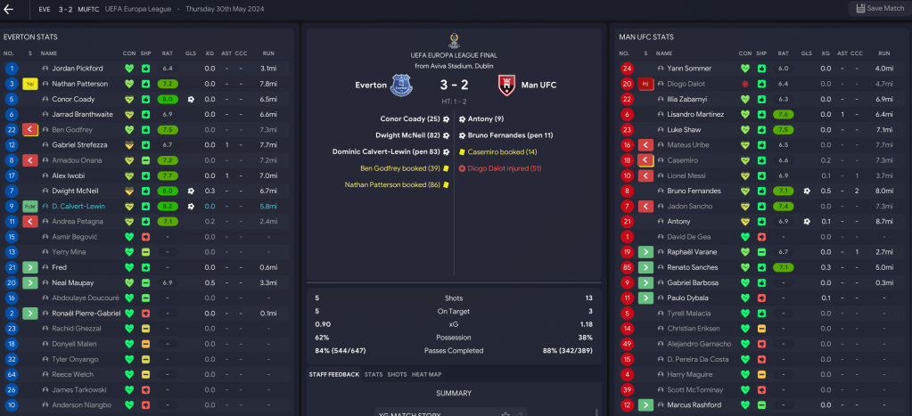 Like at Arsenal, Messi was often used in central midfield in season 2 at Chelsea, which showed as he got 5 goals and 5 assists with a 7.32 average rating in 30 league games and 10 goals, 12 assists and a 1.44 average rating in 46 games in all competitions. Chelsea dropped to 5th in the league with 72 points finishing 18 behind City. They lost to Bayern in the Champions League round of 16 but reached the FA Cup Final only to lose 2-1 to Liverpool, after beating UFC then City, and lost to City in the Carabao semis.
