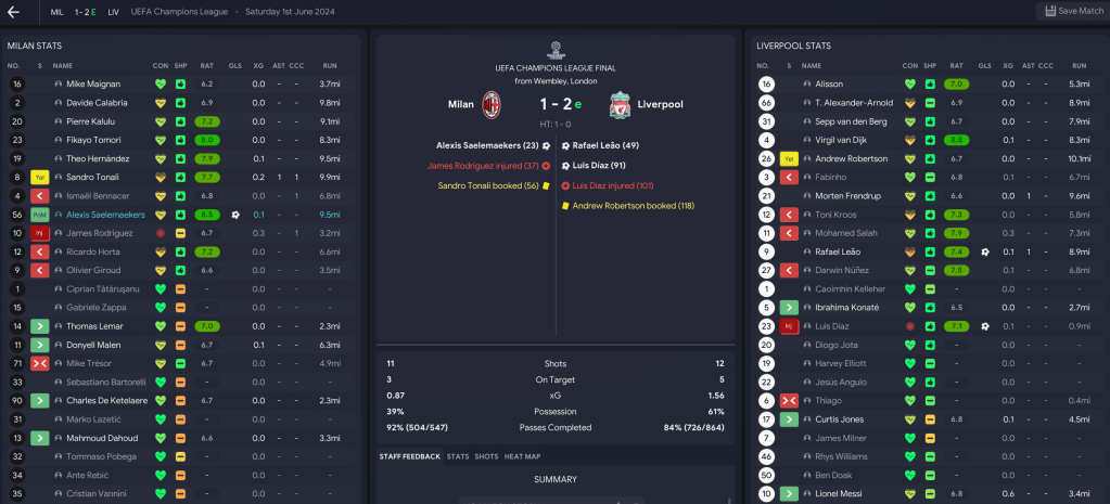 Messi faced another challenge in season 2 as Liverpool signed Rafael Leao. But he still played 30 league games, scoring 6 with 10 assists and a 7.31 average rating, and scored and assisted 12 with a 7.31 average rating in 48 games in all competitions. Liverpool again finished 3rd with 76 points, 10 points behind winners Chelsea as City fell to 7th and sacked Guardiola. However, they won the Champions League by beating Milan 2-1 after extra-time, with Messi coming off the bench, and lost both the FA Cup and Carabao finals to Man City and Man UFC.