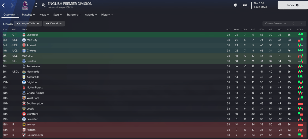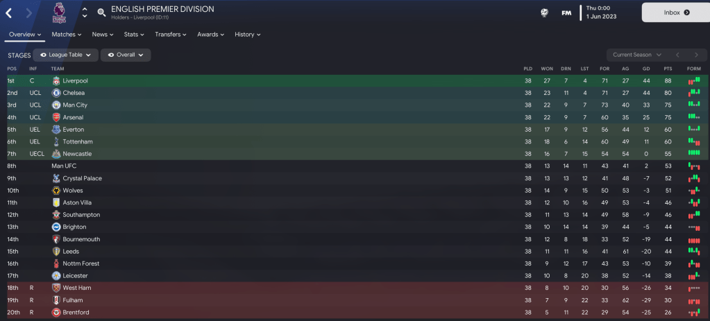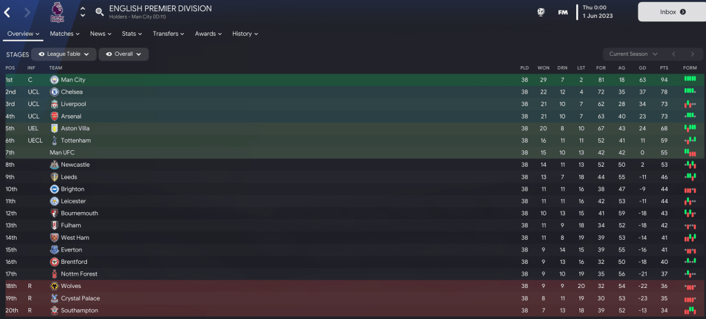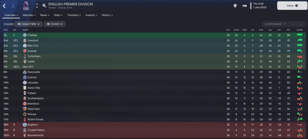 Messi was joined by Jordi Alba for season 2, along with Kaiky, Harry Winks and Davinson Sanchez in an odd transfer policy. Messi’s performances dropped off a little in season 2 with 7 goals, 6 assists and a 7.21 average rating in 38 league games. And he only played in 3 cup games, which doesn’t bode well. Brentford climbed to 11th place on 53 points, just 10 off the European places. But they went out of both cups in the 3rd round, losing to West Ham in the FA Cup and Brighton on penalties in the Carabao.