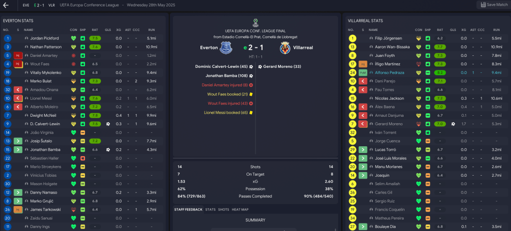 Messi enjoyed a good 1st season at Everton, scoring 9 and getting 10 assists with a 7.35 average rating in 34 league games. He also performed well in the cups, adding 2 goals and 2 assists in 5 games. Everton were looking good in mid-season, sitting 9th in March but a terrible end to the campaign saw them slump to 15th, just 5 points above the relegation zone. They also disappointed in the cups, losing to Brighton in an FA Cup 5th round replay and Southampton in the Carabao 3rd round.