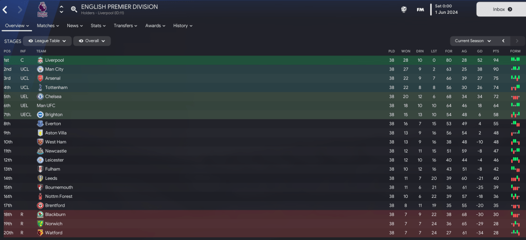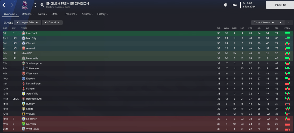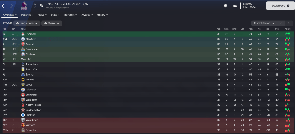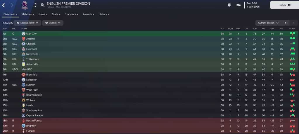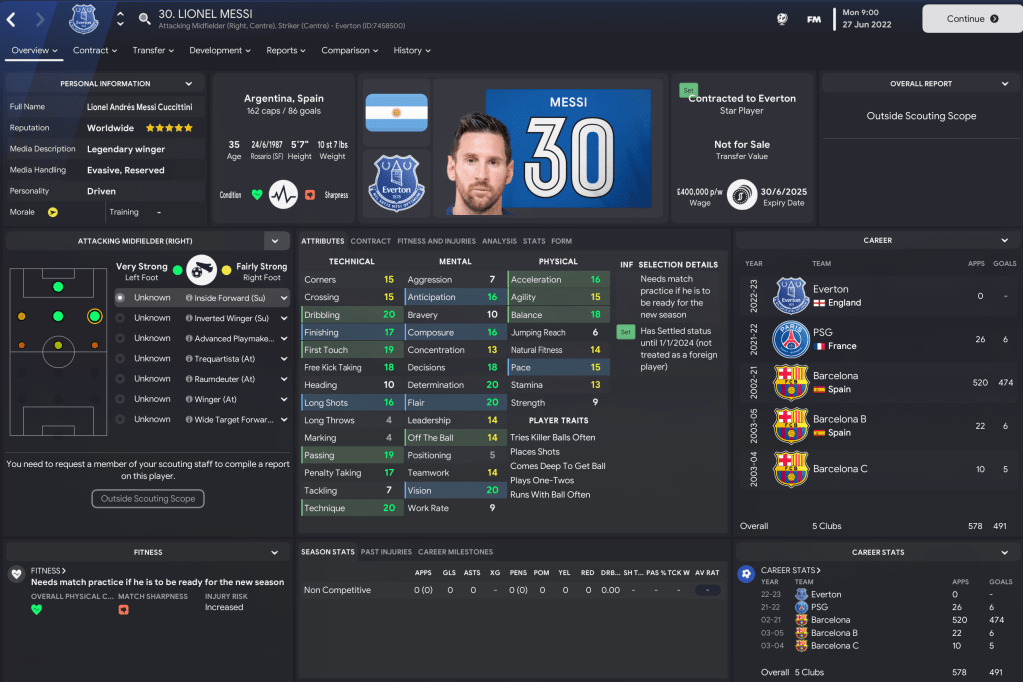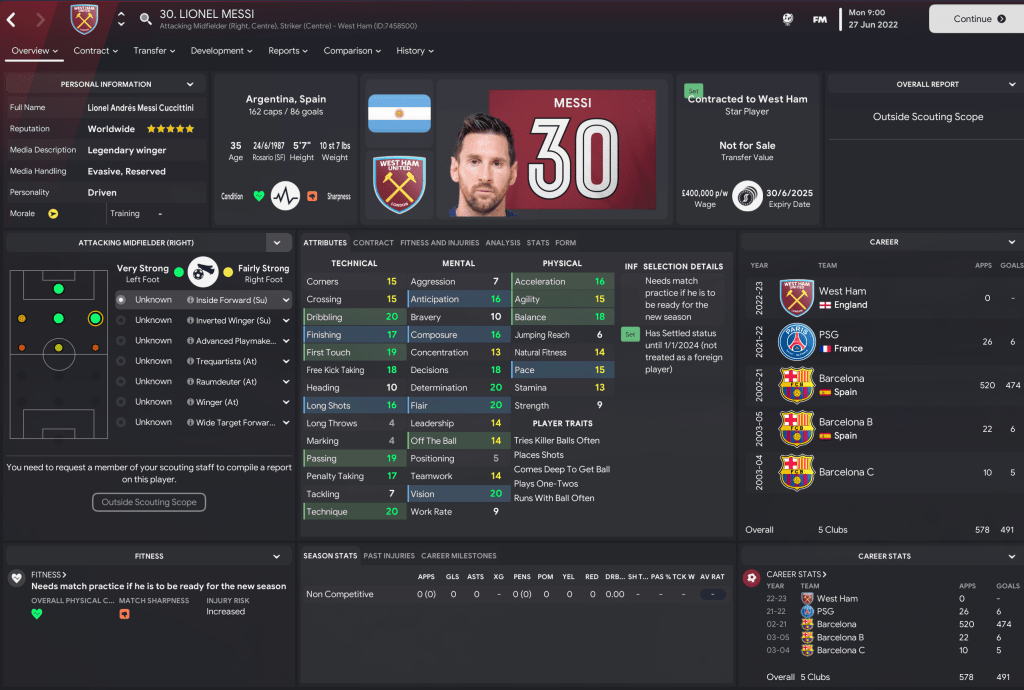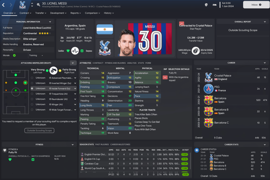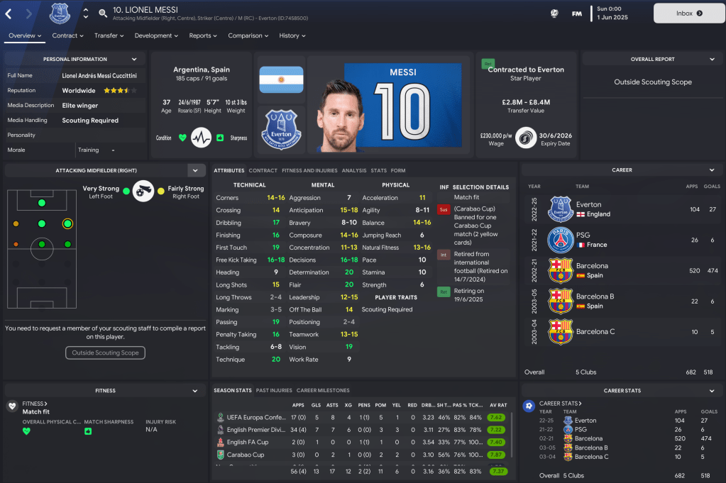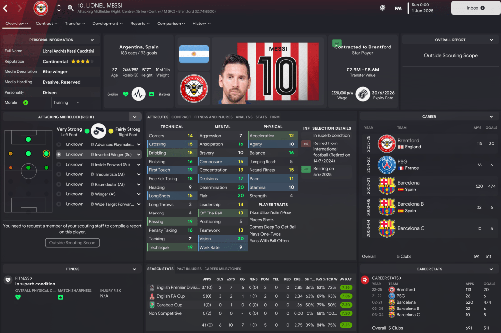 But that interest didn’t materialise and Messi had a decent final season at West Ham, scoring 7 with 6 assists and a 7.09 average rating in 34 league games and adding 2 goals in 3 cup games. Benítez resigned in July to take charge of Switzerland and was replaced by Ruud van Nistelrooij, who had a poor season as West Ham finished 14th with 39 points, only 5 points above the drop after losing their last 5 matches. They also lost to Man City in the FA Cup 3rd round and Chelsea in the Carabao 3rd round. And Messi of course retires in the summer.