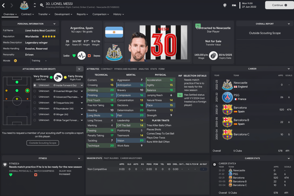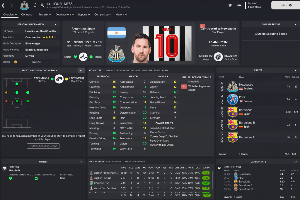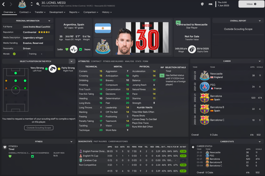 He amassed even more minutes in season 3, playing 37 league games, but his performances dropped off as he scored 8 goals with 2 assists and a 7.08 average rating. He played 52 in all competitions, scoring 9 goals with 5 assists and a 7.12 average rating. Newcastle were 17th in mid-December, when Eddie Howe was sacked and replaced with Zinedine Zidane, who led them to finish 10th. They exited the Champions League on penalties to Sociedad in the playoff round, but reached the FA Cup Final only to also lose on penalties to Liverpool and lsot to Arsenal in the Carabao semis. So overall, Messi had a pretty successful time at Newcastle – and will retire in the summer.