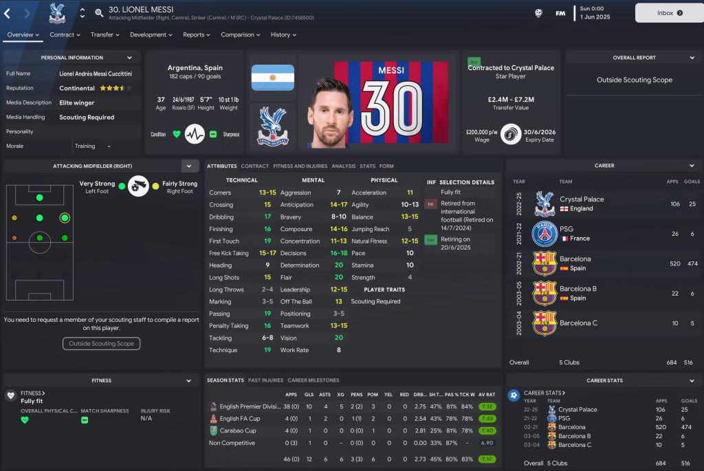Messi enjoyed his strongest 3rd season of this experiment so far, starting all 38 league games and scoring 10 goals with 4 assists and a 7.12 average rating. He also played 8 cup games, scoring 1 more goal and adding 2 more assists. However, Palace had a poor season, dropping to 16th with just 36 points and only avoiding relegation by 4 points. They lost to Arsenal in the FA Cup 5th round and Brentford in the Carabao quarters. So Messi did quite well at Palace, but the club gradually got worse – and he again retired in the summer.