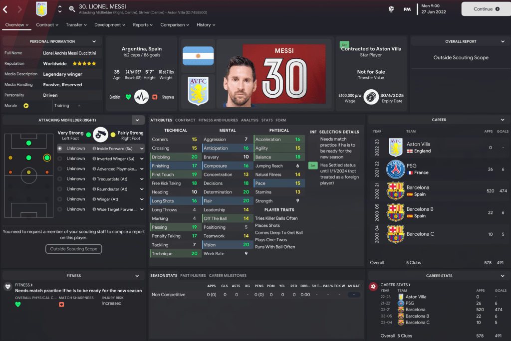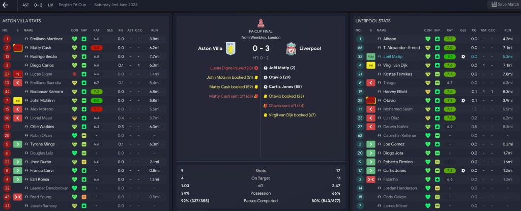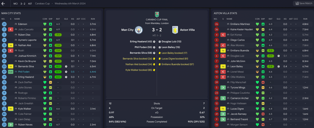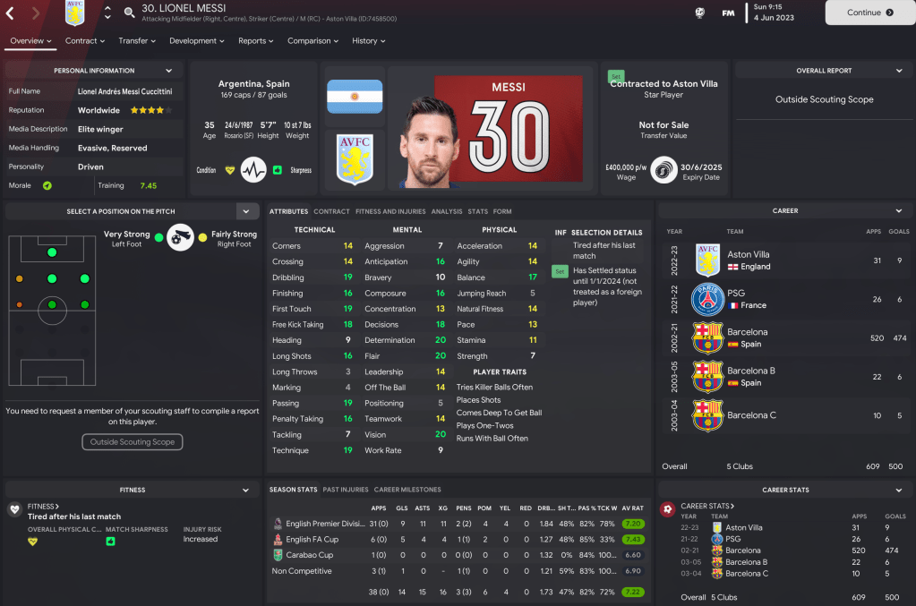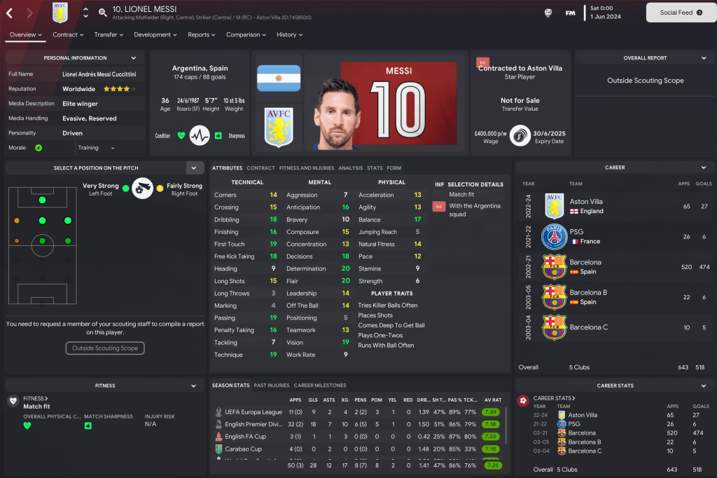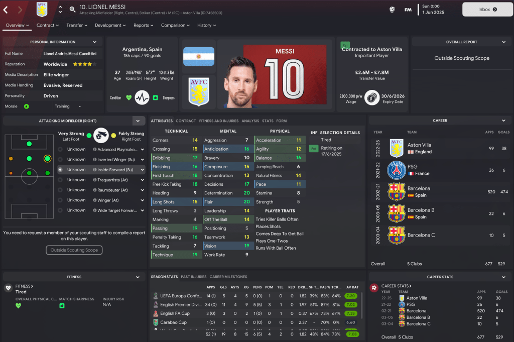 Messi also had a good 3rd season, scoring 11 with 4 assists and a 7.02 average rating in 34 league games. And he scored 19 with 8 assists and a 7.08 average rating in 51 games in all competitions. Villa finished 8th again with 53 points. But Messi ended his career with a trophy as Villa beat Köln 3-1 to win the Conference League, after they’d lost to Wolves in the FA Cup 5th round and Arsenal in the Carabao quarters.