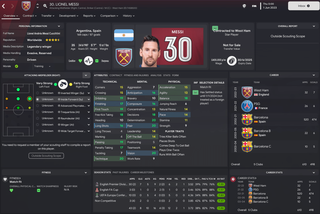 Messi was better in season 2, with 8 goals, 9 assists and a 7.40 average rating in 33 league games. And he added 2 goals and an assist in 4 cup games. That form helped West Ham to a much improved 9th place on 54 points, 11 off the European places. They lost to City in the FA Cup quarters and Burnley on penalties in the Carabao 4th round. And interestingly, for the first time in this experiment, Messi is wanted by a club with Arsenal potentially looking to sign him.