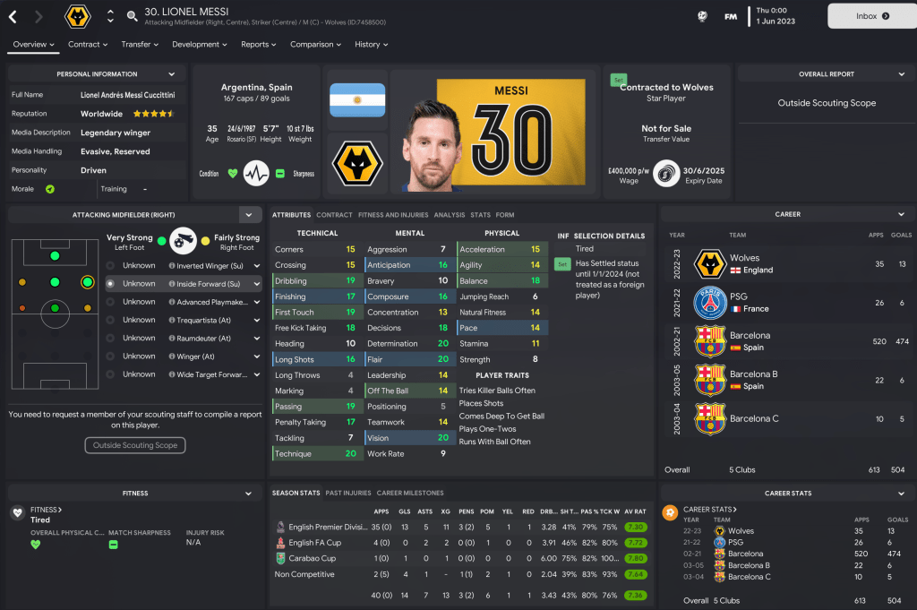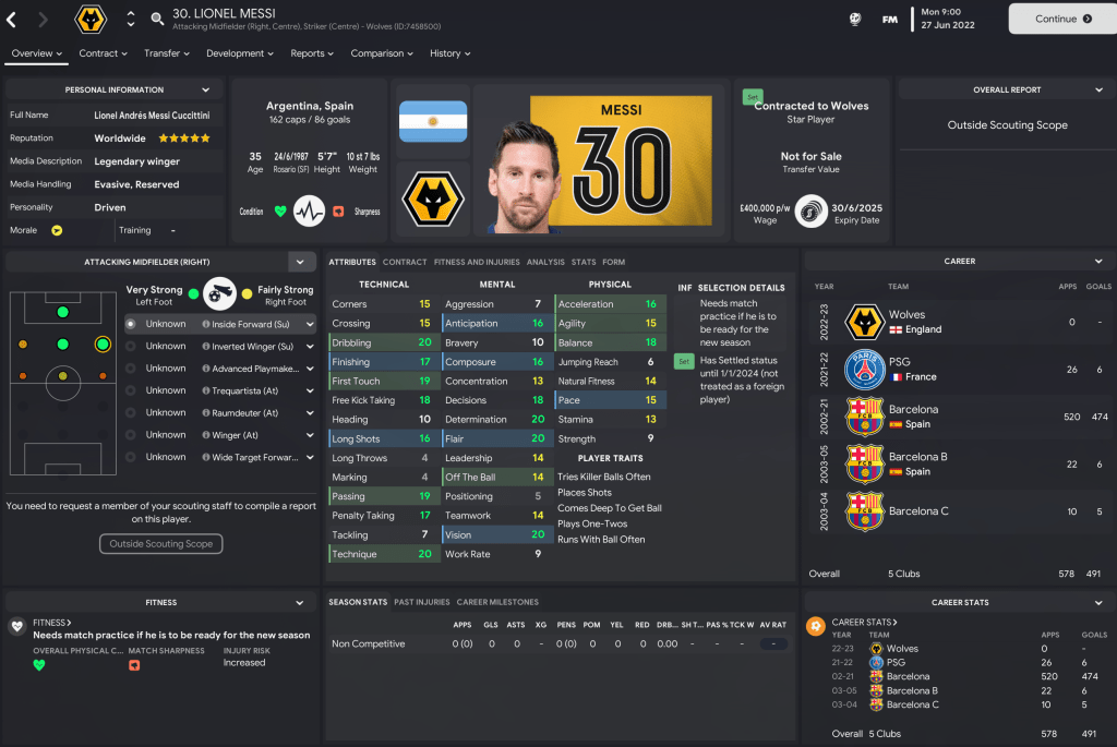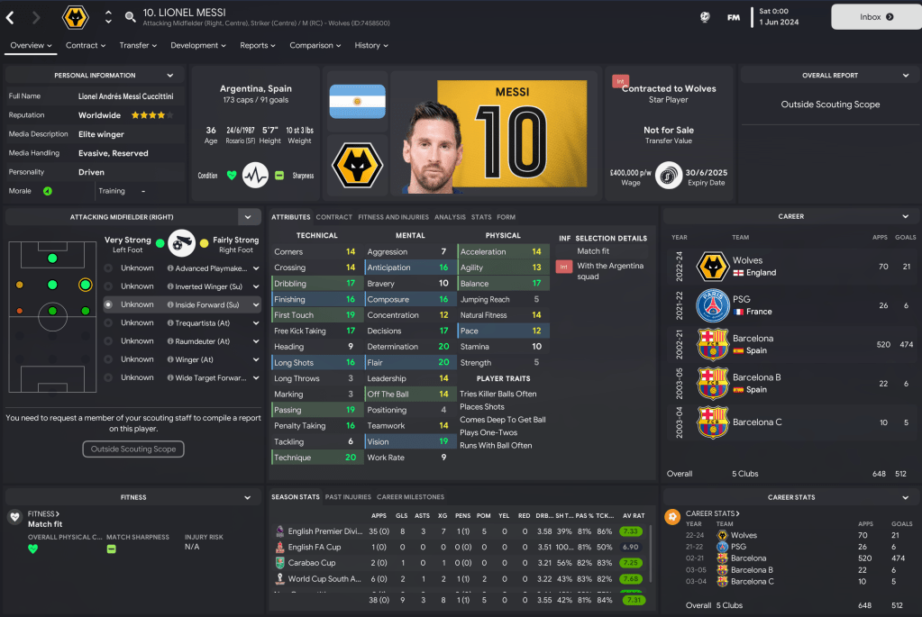 He also enjoyed a strong 3rd season, scoring 9 with 5 assists and a 7.24 average rating in 34 league games. But despite that, Messi suffered the indignity of relegation for the first time as Wolves dropped to 18th place on 33 points and with just 30 goals scored. They performed well in the cups though, reaching both domestic semi-finals only to lose to Liverpool 1-0 after extra-time in the FA Cup and to Brighton in the Carabao. Messi actually signed a new contract that halved his wages until 2026, but is retiring this summer anyway.