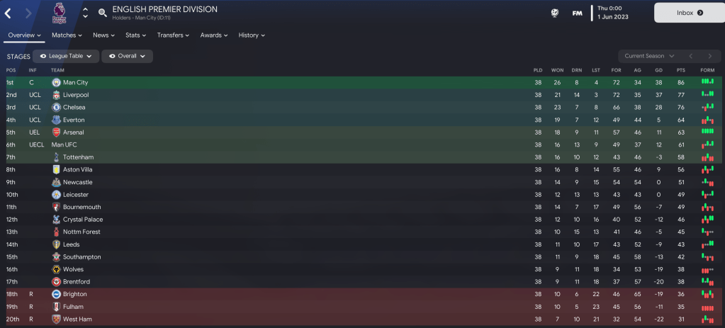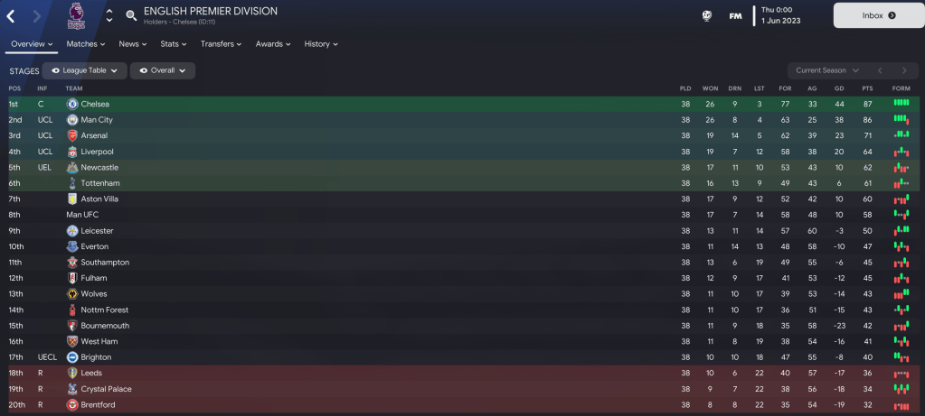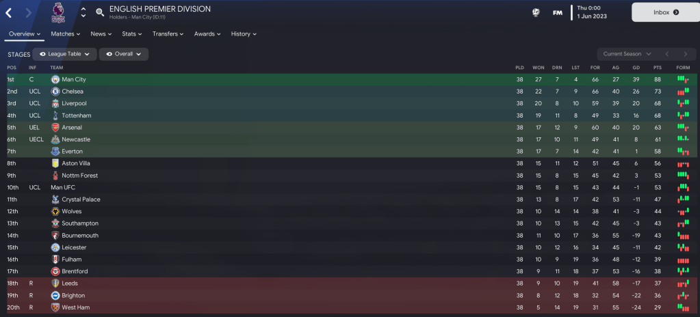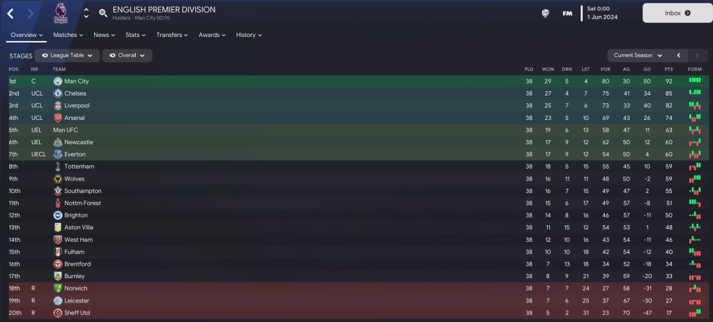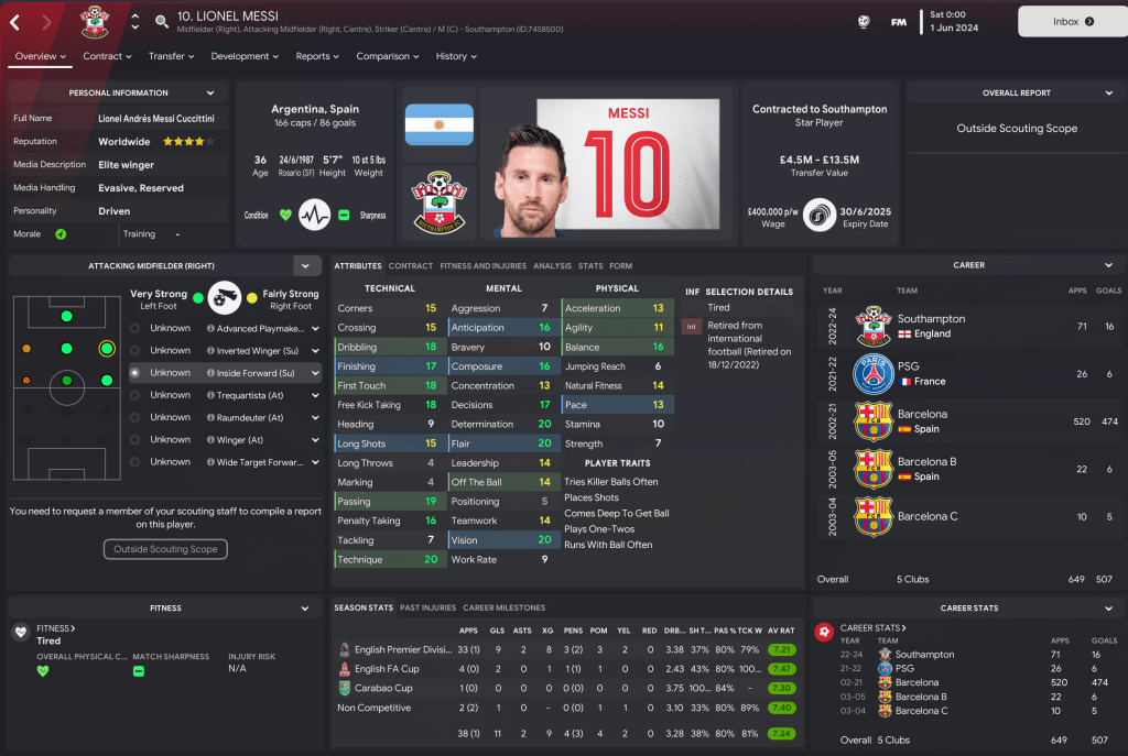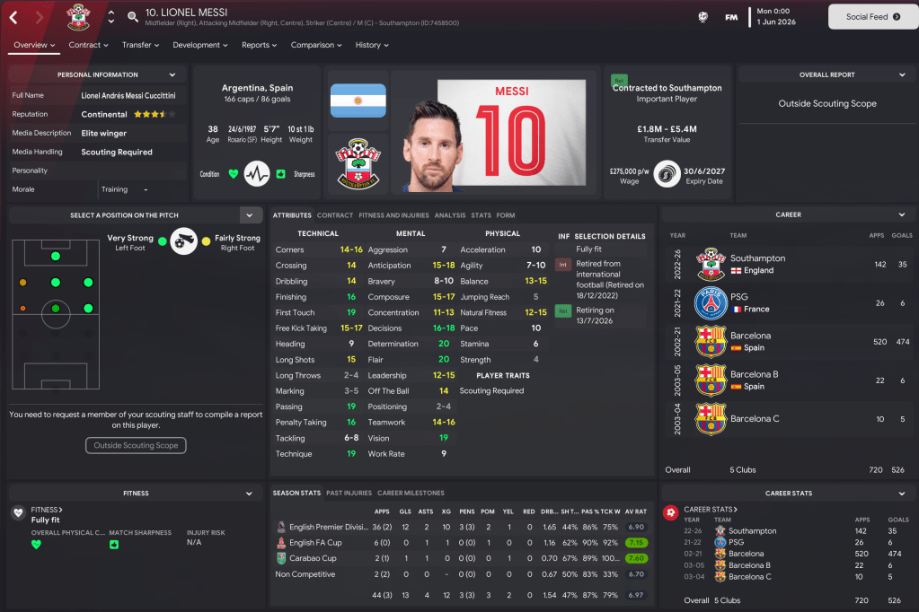 For only the 2nd time in this experiment, Messi didn’t retire and stayed for a 4th season at Saints. And at the age of 38 he played in all 38 league games, largely as a striker, scoring 12 goals with 2 assists and a 6.90 average rating. He added a goal and 2 assists in 9 cup games. Saints dropped to 17th in the league with 35 points, only avoiding relegation by 1 point. But they reached the FA Cup semis and only lost 1-0 to City after extra-time and lost to Palace in the Carabao 4th round. And this time, Messi did retire.