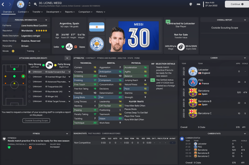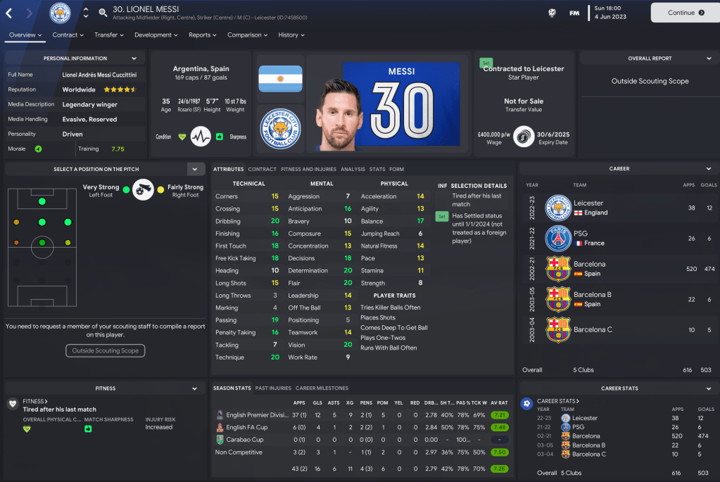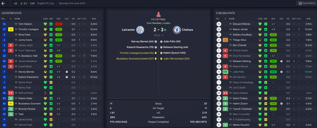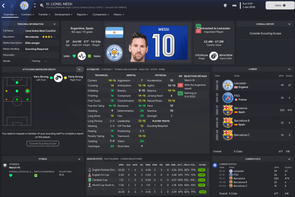 Messi took the captaincy in season 3 but only played 26 league games, scoring 7 with 6 assists and a solid 7.35 average rating, plus 1 goal in 4 cup games. And Leicester’s form picked up as they finished 7th on 60 points to qualify for the Europa League. But they exited both cups in the 4th rounds, losing to Chelsea in the FA Cup and Sunderland in the Carabao. And Messi retired having led Leicester into Europe.
