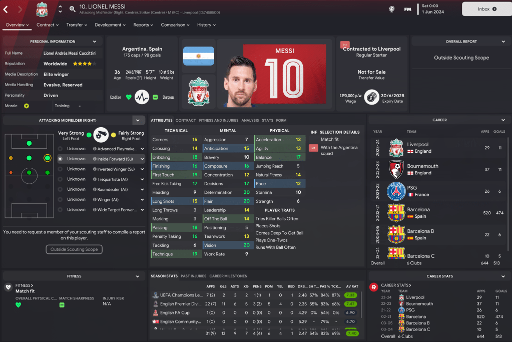 He had a good start, scoring 11 goals with 5 assists and a 7.46 average rating in 37 league games. However, that wasn’t enough to save Bournemouth from relegation as they lost their last 9 matches and finished 19th with 30 points, 5 away from safety. They weren’t much better in the cups, losing to Villa in the FA Cup 4th round and Birmingham in the Carabao 3rd round. And with Bournemouth going down, it looks like we could see Messi on the move for the first time in this experiment with Chelsea, Liverpool, Atlético and Barca all interested in him.