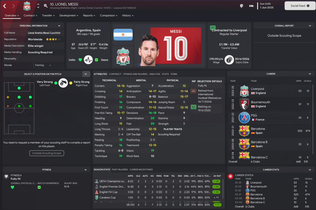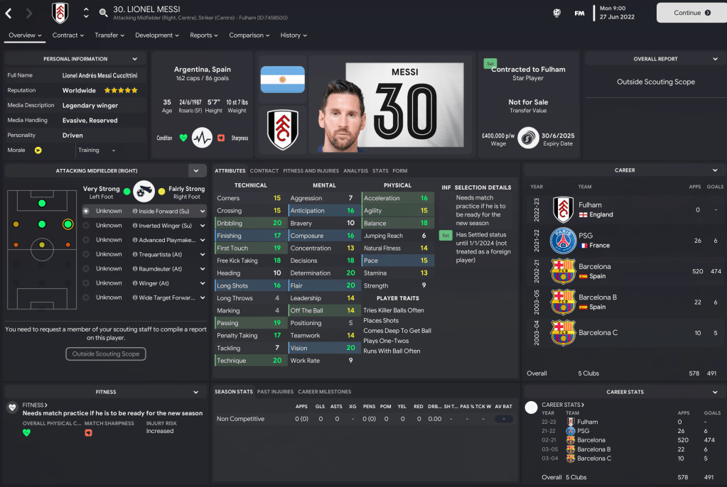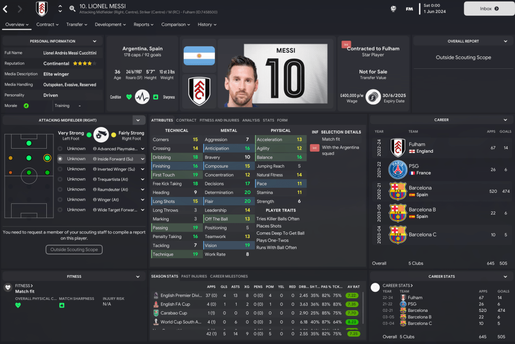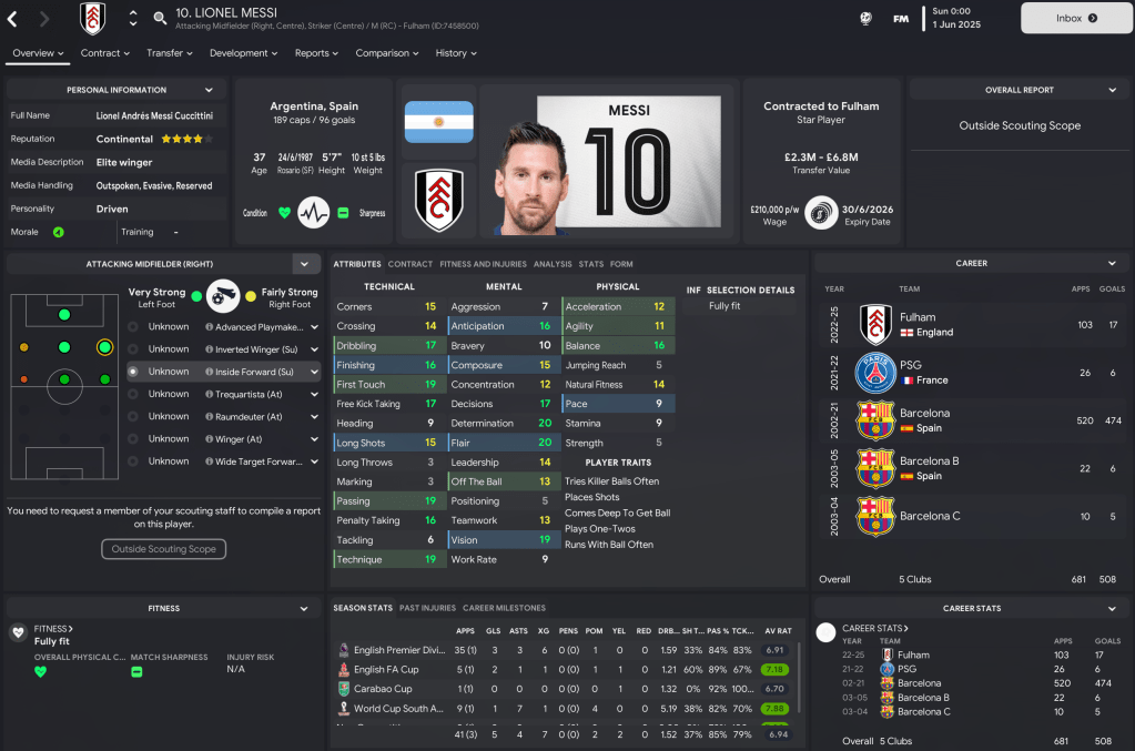 Messi moved back into a central midfield role for season 3 and his form tailed off with 3 goals and 3 assists and a 6.91 average rating in 36 league games, adding 2 goals and an assist in 8 cup games. Fulham improved to 12th on 45 points but lost to Liverpool in the FA Cup quarters and Forest in the Carabao 3rd round. And he eventualy decided to retire in the summer.