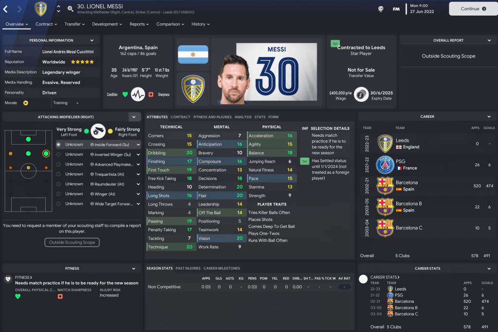 Messi was good again in season 3 as he started every league game and scored 8 goals with 4 assists and a 7.14 average rating, adding 1 assist in 5 cup games. However, that wasn’t enough to save a poor Leeds side as they were relegated in 18th place with 37 points, which was 2 from safety. They lost to Bournemouth in the FA Cup 3rd round and Palace in the Carabao quarters. So Messi finished his career with another relegation.