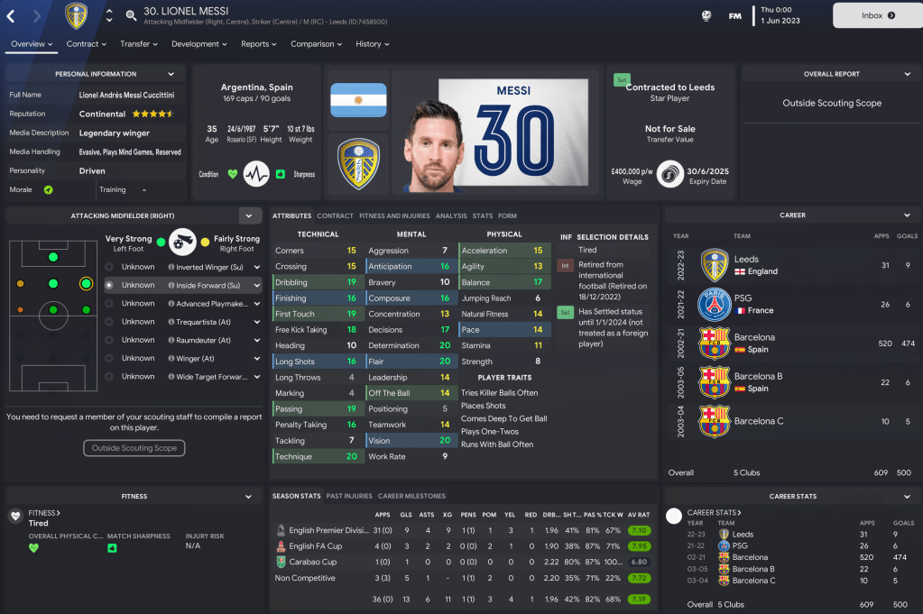 Messi started well as he scored 9 and got 4 assists with a 7.10 average rating in 31 league games in his 1st season at Leeds, adding 4 goals and 2 assists in 5 cup games. Leeds started the season poorly and sacked Javi Gracia in February, replacing him with Rafa Benitez. They eventually climbed the table to finish 14th on 45 points but disappointingly lost 2-1 to Norwich in the FA Cup quarters and 4-3 to Newcastle in the Carabao 2nd round.