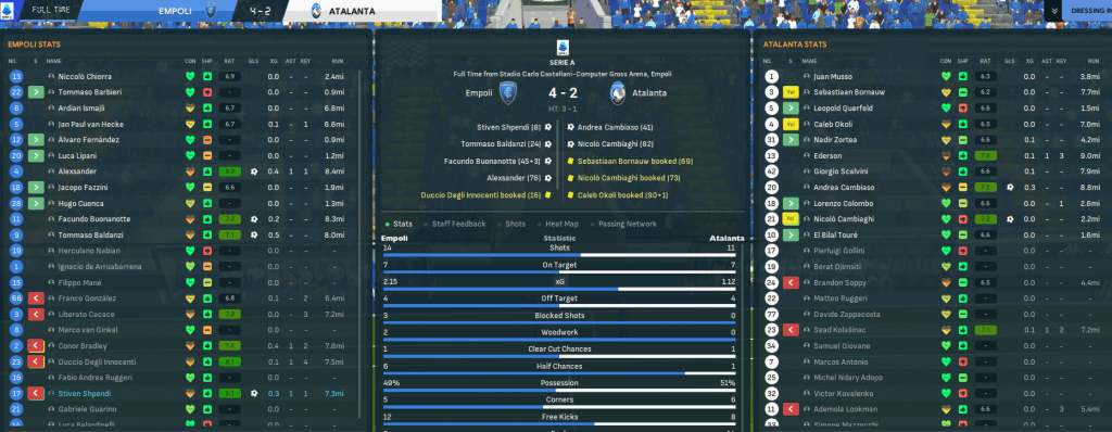 That meant we had to throw in backup keeper Niccoló Chiorra, who is terrible, and we unsurprisingly got thumped 5-0 at Inter. However, for context, they spend 10 times more than us on wages and bring in £114m in commercial income compared to our £5.5m. In other words, Serie A isn’t fair! We were then abysmal in the first half at home to Bologna, who finished 7th last season, trailing 2-0 from three shots on target. But a stern half-time team talk did the trick as winger Stiven Shpendi’s double earned a point.