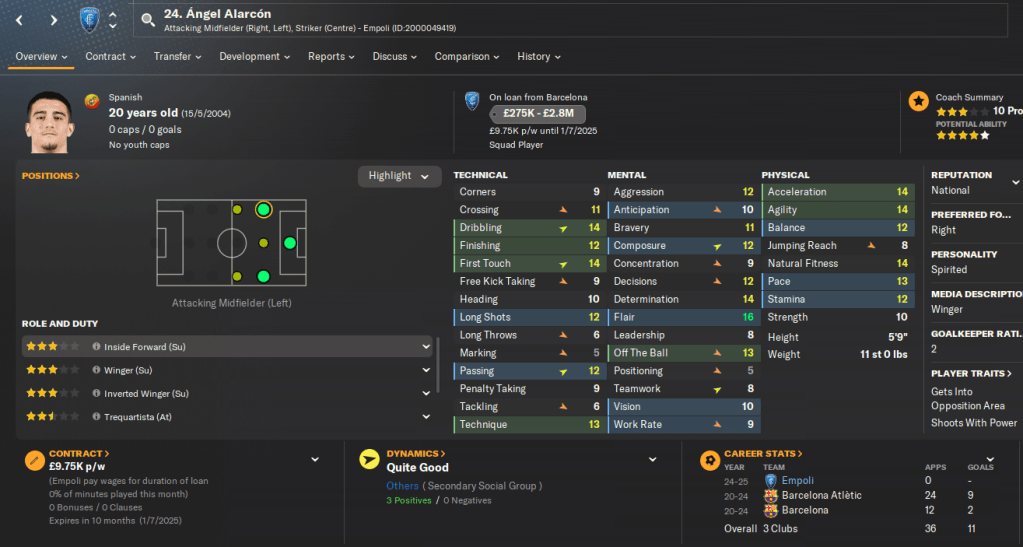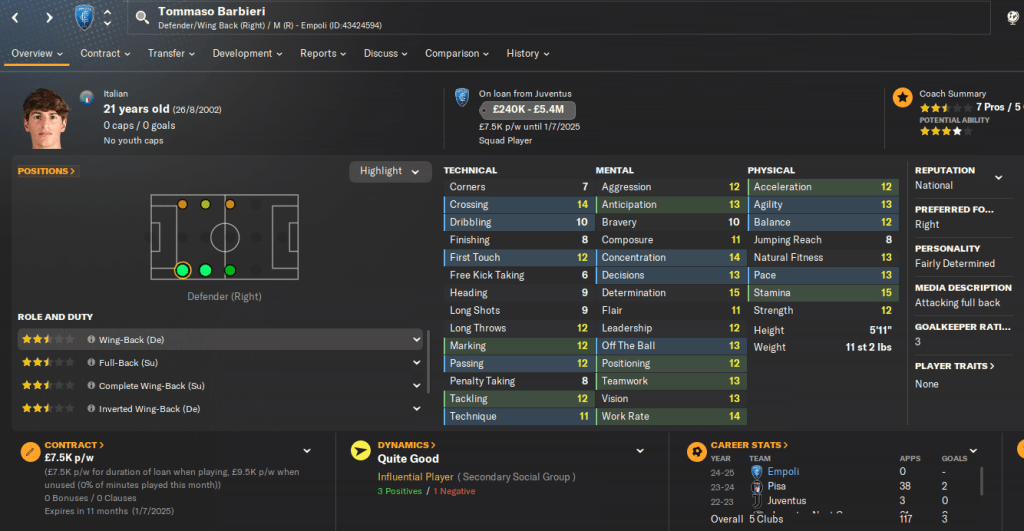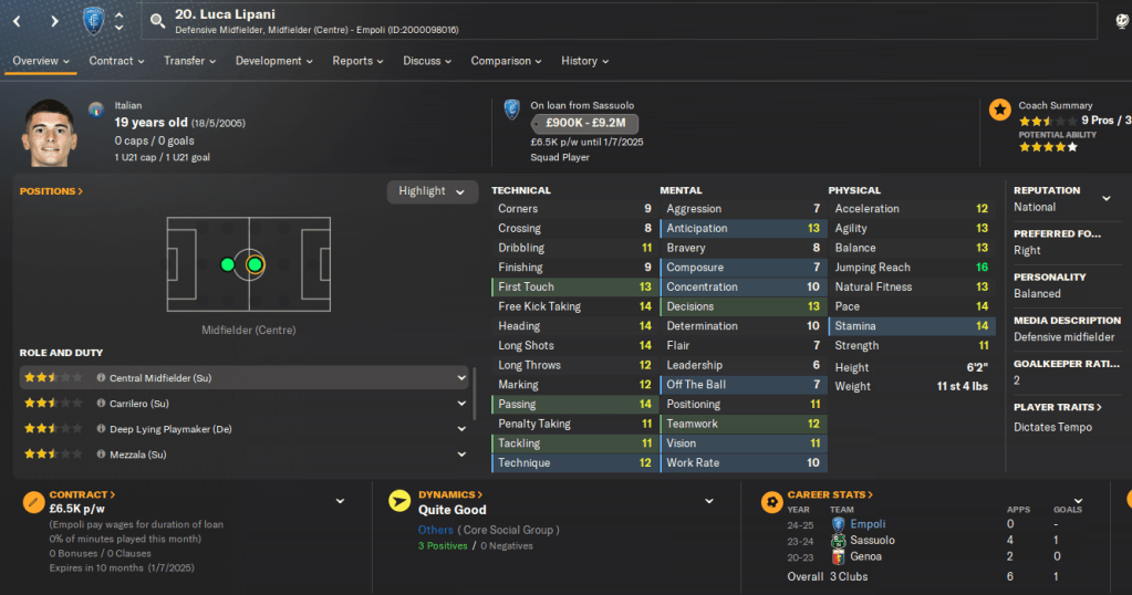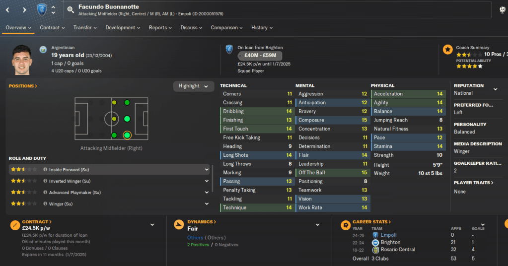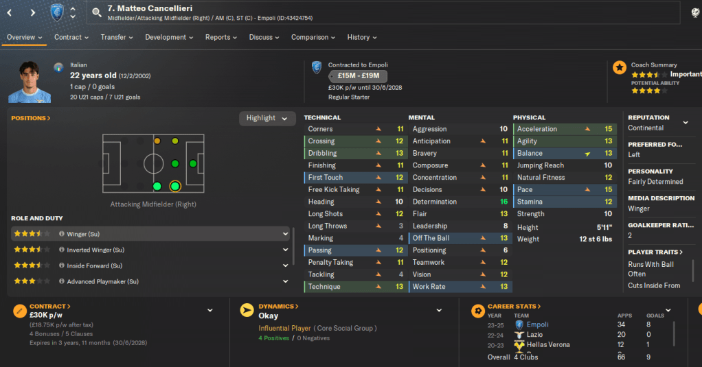 Our good form so far this season earned me a new three-year contract on £16.5k per week. So there were plenty of positives around Empoli FC. However, it looks increasingly likely that we will lose top scorer Baldanzi, who told me he wants to join a club with a stronger squad and agreed to an asking price of £50m.