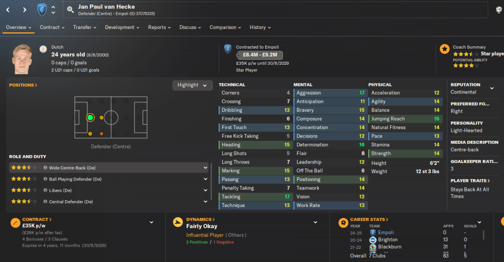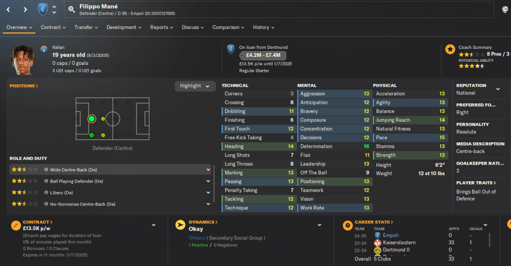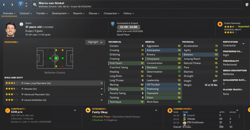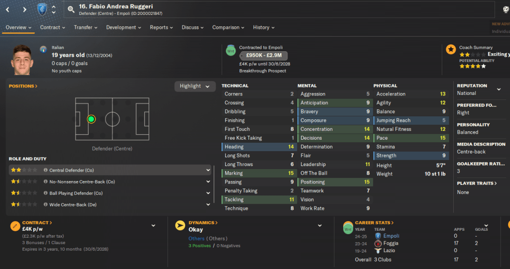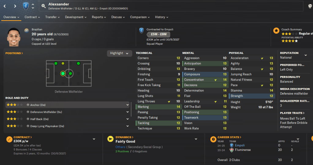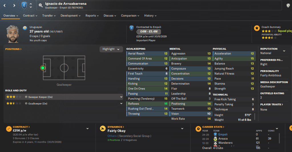 Our first permanent signing of this save was Matteo Cancellieri, who was probably our best player on loan last season and signed for £3.9m rising to £8m. We spent £4.6m on holding midfielder Alexsander, who can also provide cover at left-back and left wing, and £2.8m on Lazio’s promising centre-back Fabio Andrea Ruggeri. We also turned to free transfers to fill key positions, bringing in Brighton centre-back Jan Paul van Hecke, goalkeeper Ignacio de Arruabarrena and former PSV and Chelsea midfielder Marco van Ginkel, who brings a little experience to the squad. We were also bolstered by 21-year-old homegrown prospect Duccio Degli Innocenti returning from a loan at Lecco, where he got eight assists in Serie B last season. And on deadline day, we snapped up 20-year-old midfielder Franco González for £3m from Penarol, who had quoted us £10m two months ago, and he chose us ahead of Inter and Milan.