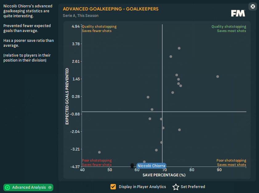 Just when I thought we were getting somewhere, Chiorra went and conceded the only two shots on target at Lecce and we lost 2-1 despite Shpendi’s sumptuous volley. Chiorra has now conceded 13 in 6 matches and, as this graph shows, he is the worst goalkeeper in Serie A, saving 58% of shots.