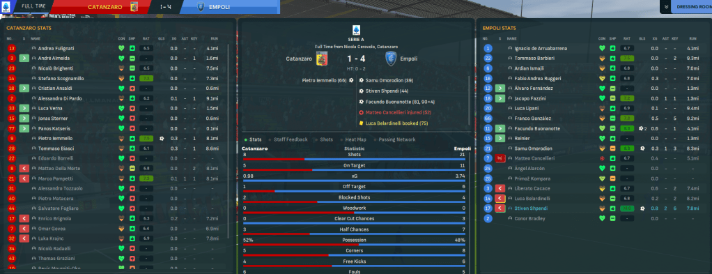 Weiper picked up a foot injury, amid a huge defender and midfielder injury crisis, so Samu came in for his debut at bottom side Catanzaro. We bossed the game and Samu eventually put us ahead then laid on the second for Stiven Shpendi. The hosts undeservedly got back into it but the underperforming Facundo Buonanotte came off the bench to bag a late double, which doubled his tally for the campaign.