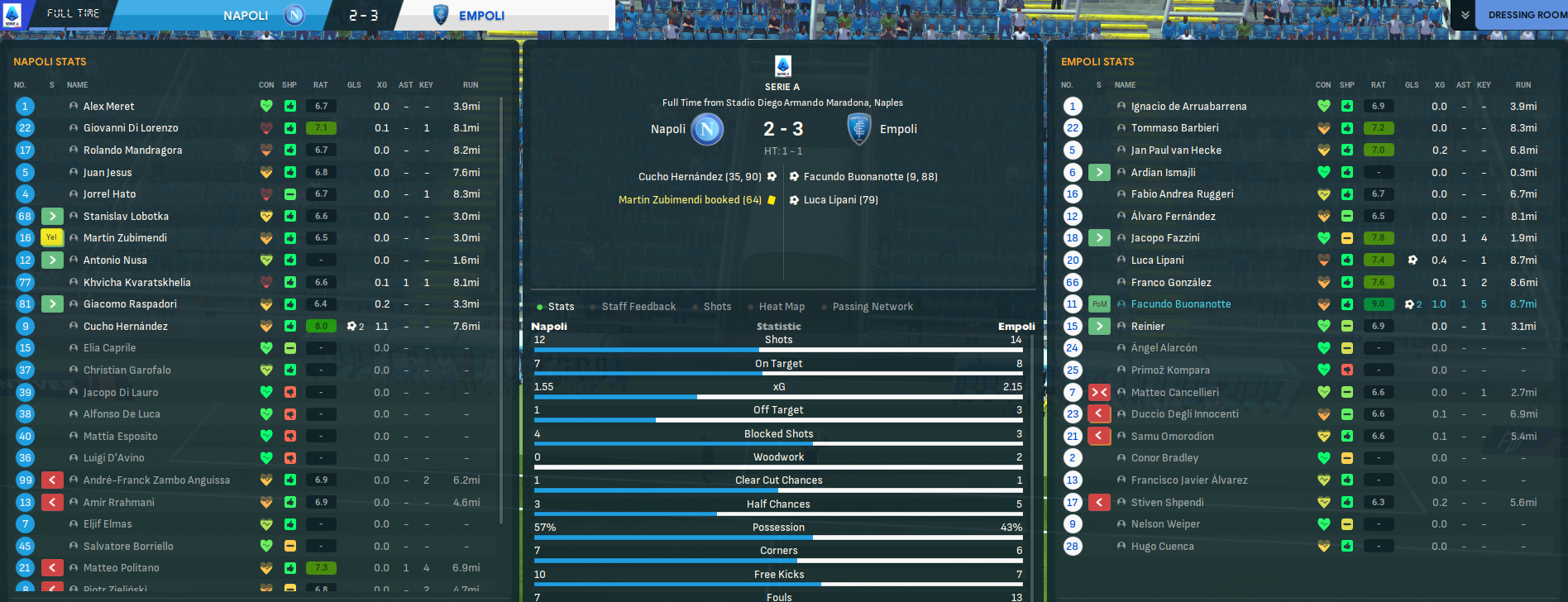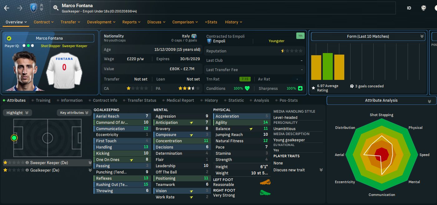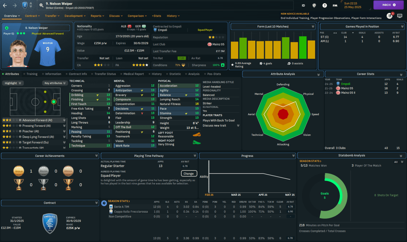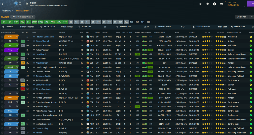 One of the strangest matches of the save so far saw Weiper score his first goal from a corner while we restricted Hellas Verona to zero shots. We backed that up by being the better team but lacking the finish in a 0-0 at home to Lazio. The defensive stability was long-forgotten with a poor performance in a 3-1 defeat at Salernitana, in which left-back Liberato Cacace scored our best goal of the save so far, but we recovered to ease past Palermo 3-1 at home.