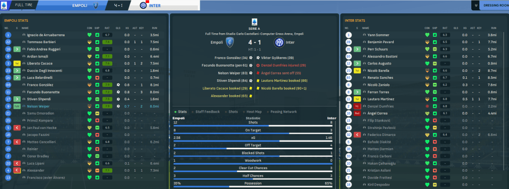 That left us just four points behind Juventus in the final European spot heading into the final five games. Hopes of that eased with an unlucky 1-0 loss at Sassuolo but we responded in style back at Stadio Carlo Castellani. We welcomed Inter to town and had the audacity to take the lead through midfielder Franco González only for Inter to immediately respond. However, Correa was sent off for a shocking two-footer from behind then Buonanotte won and converted a penalty six minutes later. And from there we took control and killed the game off with late Weiper and Shpendi strikes to thrash the leaders 4-1!