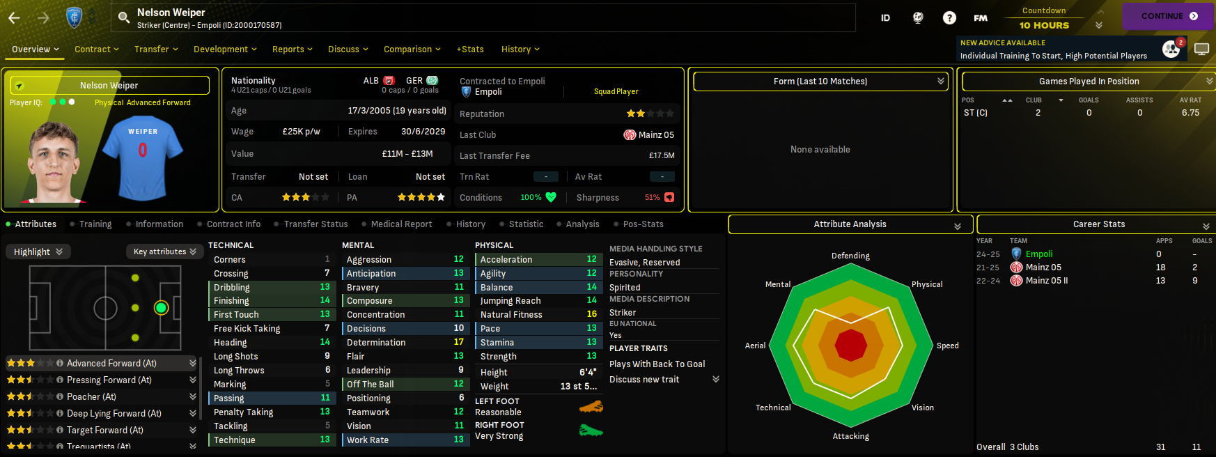 That meant a bit of a scramble to try and find a replacement on deadline day, which proved very challenging. But I eventually went for 19-year-old 6ft 4in Mainz striker Nelson Weiper, who’s a very different type of striker given he’s nine inches taller than Baldanzi! He cost £8.5m rising to £17.5m, which was also a new club record, usurping the £7.75m paid to Palermo for Antonino La Gumina in July 2019.