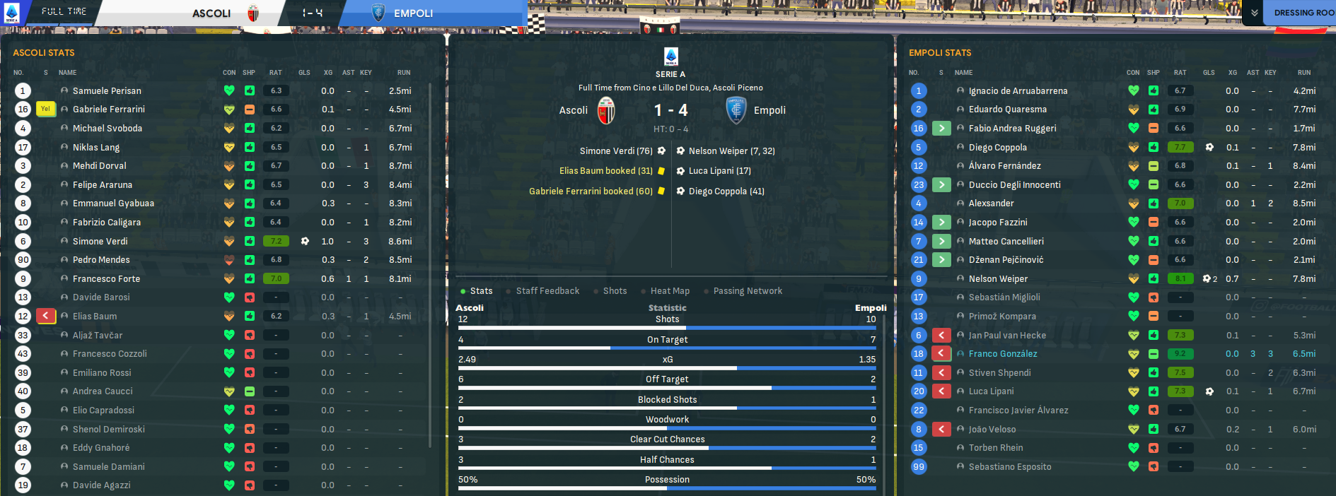 We then welcomed Inter, who spend seven times more than us on wages so I trialled a new more defensive approach. And it worked as Weiper’s goal 25 seconds after the break cancelled out Zaniolo’s opener to nick a point. We took the confidence from that to newly promoted Ascoli as a Franco González masterclass saw him create three first-half goals before Coppola headed home a fourth.