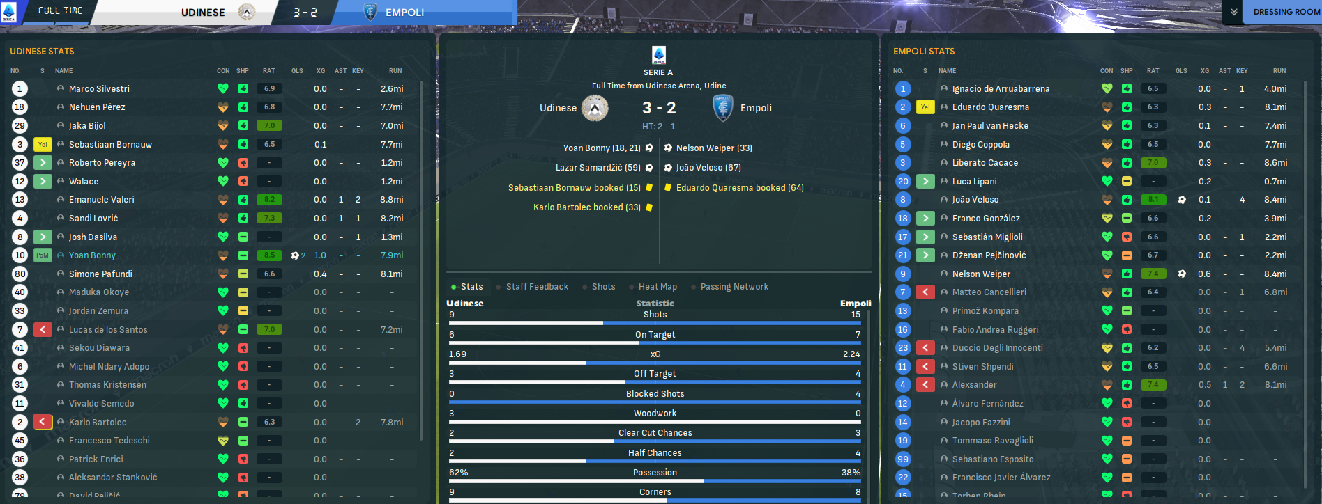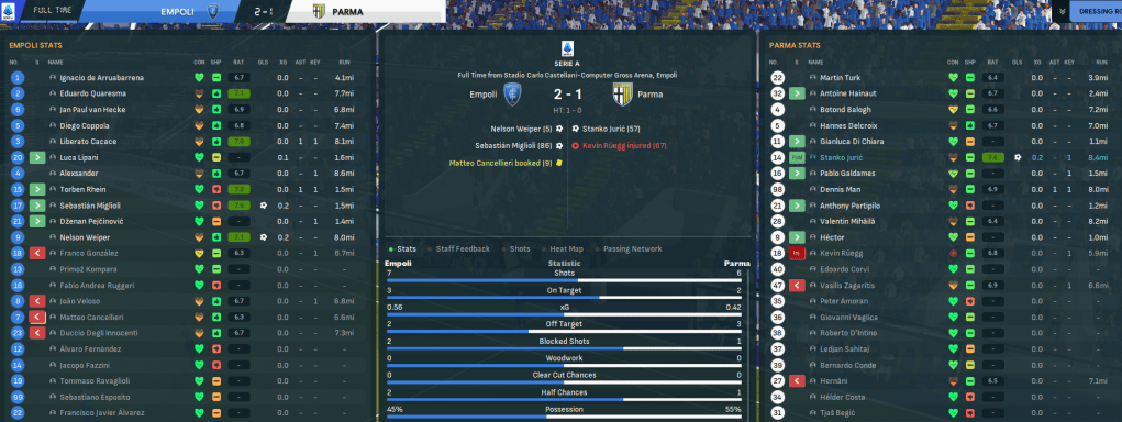 We again began at home to a promoted side as we welcomed Parma, weirdly on a Wednesday night. Nelson Weiper fired us ahead but we struggled to create and Parma punished us, I made changes and Miglioli cut in off the right to deliver a debut 86th-minute winner. Our first away day took us to bogey side Udinese, who scored twice early and, despite Weiper and a Veloso screamer then dominating, we somehow lost 3-2. And that’s five defeats and a draw in six meetings with Udinese! We’d also never beaten Torino, who we travelled to next, but bucked that trend with Lipani and Weiper strikes.