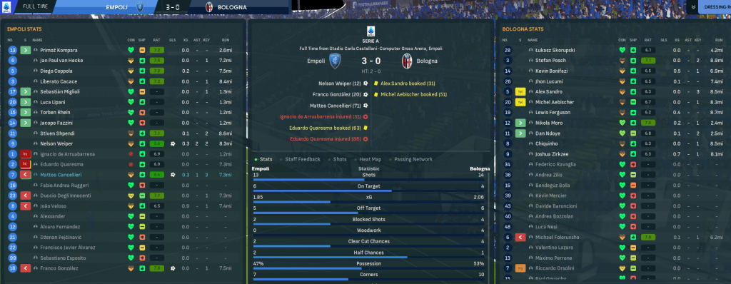 Our struggles prompted a change in shape, moving to a more conventional 4-3-3 with one holding midfielder. It started well as we won 4-1 at Hellas Verona with goals by Weiper, Cancellieri, Shpendi and Veloso, which took us to six wins out of seven against Verona, then a González double inspired a 2-1 victory at Lecce. We dominated at home to Genoa, racking up 18 shots, nine on target and 2.52 xG but only managed a 1-0 win through Weiper’s early strike.