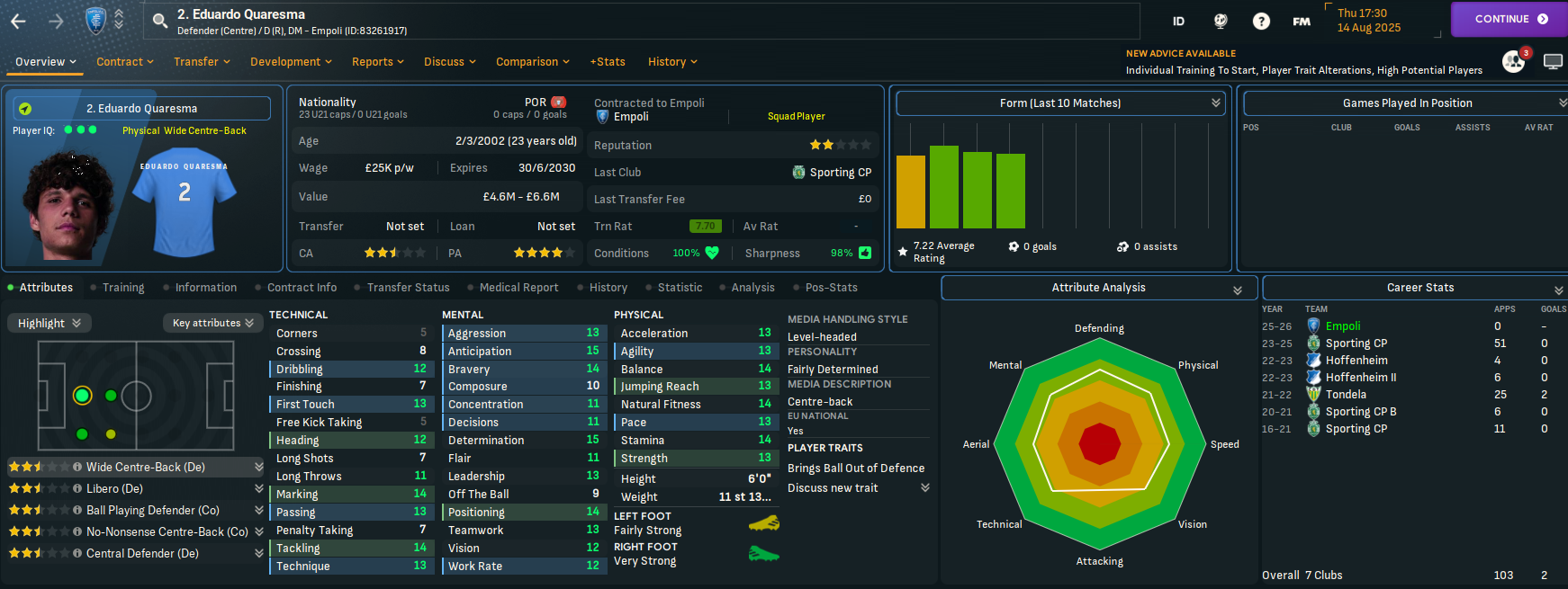 But we weren’t done there. We spent £7.5m on Hellas Verona centre-back Diego Coppola and £1.5m on PSG winger Dzenan Pejcinovic. We also signed Bayern midfielder Torben Rhein and Sporting centre-back Eduardo Quaresma, who’s a personal favorite from my Saving Sporting save on FM20, on free transfers. But the most exciting deal may be bringing in Joao Veloso on loan from Spurs (who signed him for £3.7m and ruined him for a year).