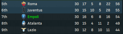 With eight games remaining, we found ourselves 7th in Serie A, just two points behind 5th-place Roma and 10 clear of 9th-place Lazio.