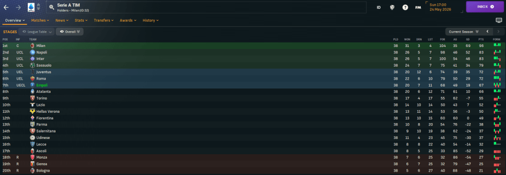 That big final-day win saw us confirm a 7th-place finish, which equals Empoli’s all-time record-high finish. However, we only received a paltry £5.4m in prize money, which is absolutely pathetic. And that meant Empoli initially qualified for the European Conference League, before being bumped up to the Europa League! We finished on 67 points, scoring 68 and conceding 49, winning 20 matches with 11 defeats and seven draws.