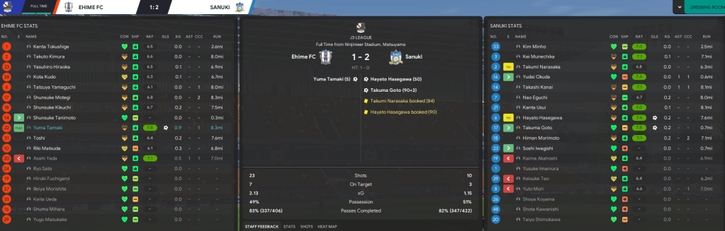 Two more big games followed with trips to teams expected to struggle. First up was Sagamihara, where they started well with Mori setting up Akahoshi before Rasamu was delighted to see his newly-instilled short free-kick routine work as Mori created another for Akahoshi. The hosts scored in injury time but Sanuki held on to claim Rasamu’s first away victory – despite having seven shots to 18. Next up was Nara Club, who were also overperforming in 9th. Akahoshi scored again on eight minutes but Nara were soon level with a ridiculously good free-kick. Morimoto responded with a stunning 25-yard strike, which won the August goal of the month, but Sanuki were wasteful and Nara came back to get a 2-2. However, Rasamu was yet again delighted with the team’s efforts as they had significantly more shots and xG.