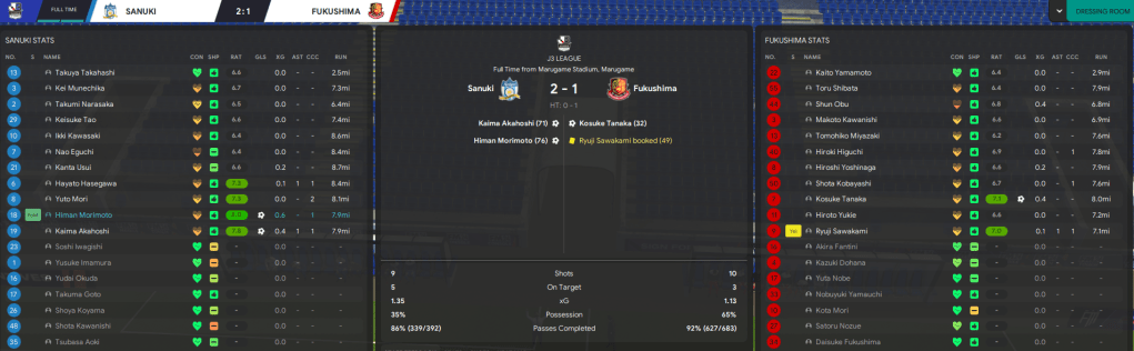 The Sanuki supporters got their first look at Rasamu as they welcomed 11th-place Fukushima to Marugame Stadium. And they wouldn’t have been impressed by a first half that Fukuhashi dominated and again scored a long-range strike. But Rasamu offered a glimpse of his tactical nous after the break, shifting to two central midfielders and his side suddenly seized control. Midfielder Hayato Hasegawa teed up an equaliser for Akahoshi, who five minutes later sent Morimoto through to calmly convert. And Robaato Rasamu had his first win as a Football Manager.