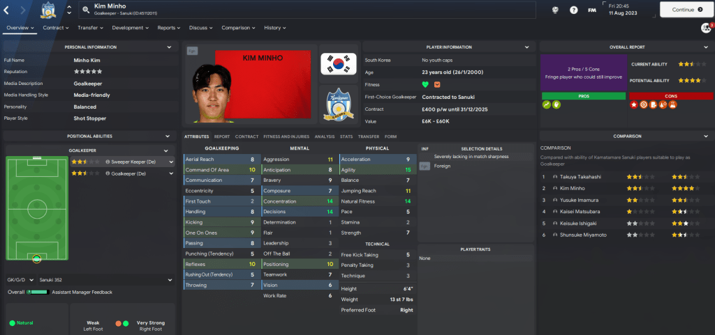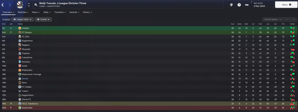 Takahashi’s issues prompted Rasamu to make his first transfer, agreeing on a pre-contract deal with 23-year-old Korean keeper Kim Minho and then signing him for £3k from Nagano. Minho made his home debut in the North Shikoku Derby against promotion-chasing Imabari and delivered Rasamu’s first clean sheet in a pretty tepid 0-0. So after five games, Rasamu had only lost once, won twice and drawn twice, moving his Sanuki side 15 points clear of the dropzone.