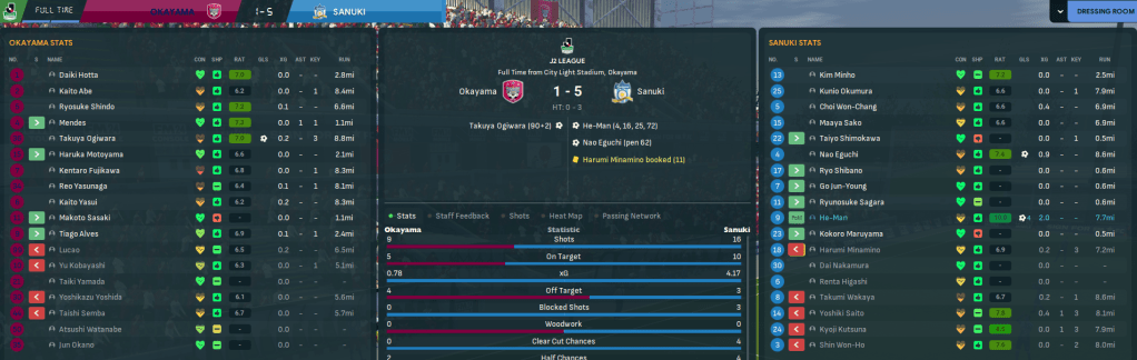 The second half of the season began with fans’ (and manager’s) favourite Himan “He-Man” Manimoto bagging a hat-trick inside 25 minutes at 4th-place Okayama. Nao Eguchi scored a penalty before He-Man bagged his fourth to wrap up an incredible 5-1 victory.