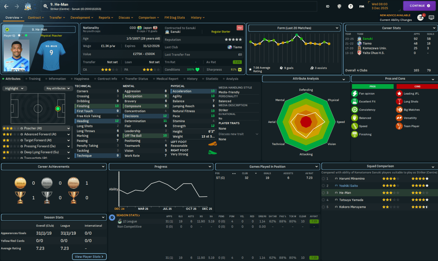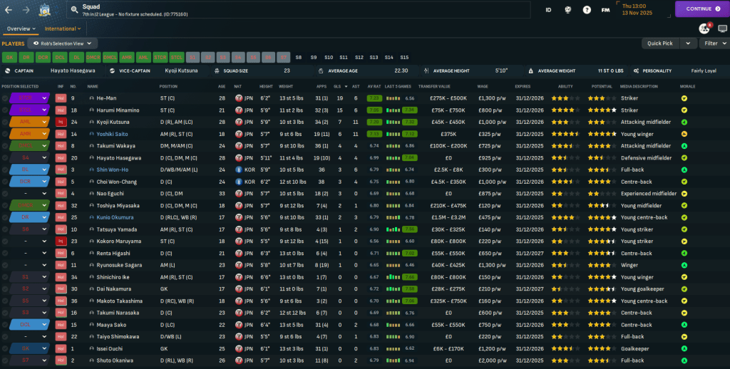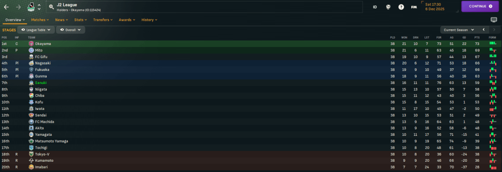 Rasamu leaves Sanuki with a 47% win percentage from 103 games. He won 49, drew 24 and lost 30 with his sides scoring 211 and conceding 158. But the move to Niigata will be a huge opportunity for Rasamu. He goes from a debt-ridden club where he’s spent a total of £3k in transfers and has a transfer budget of £289k going into the next season to one handing him a £15m transfer budget.