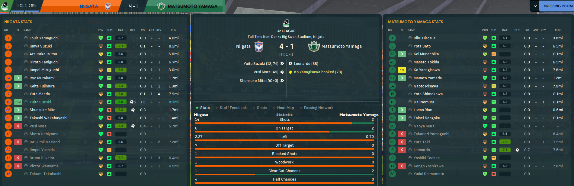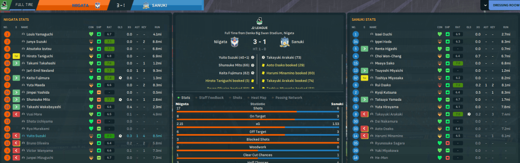 Another dominant performance saw Niigata rack up 15 shots to five at Tosu and win 2-0 with Wanyama scoring his first goal for the club from the penalty spot. That saw them into the halfway point of the season still unbeaten and with an incredible 16 wins out of 19. As a result, they have an 11-point lead over Nagasaki, who’ve played a game more, and are 15 clear of Gifu. They’ve already scored 50 goals, which is 16 more than anyone else, and have only conceded 16. While More is the J2 top scorer with 14 and leads the league with a 7.51 average rating and five player of the match awards.