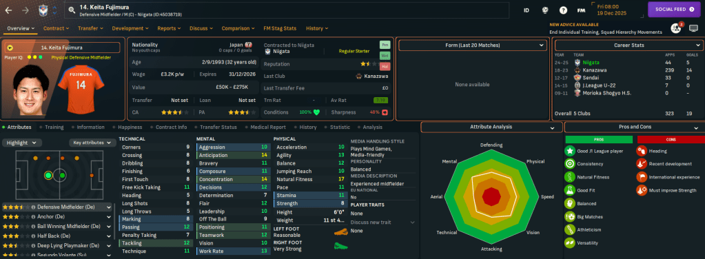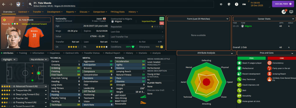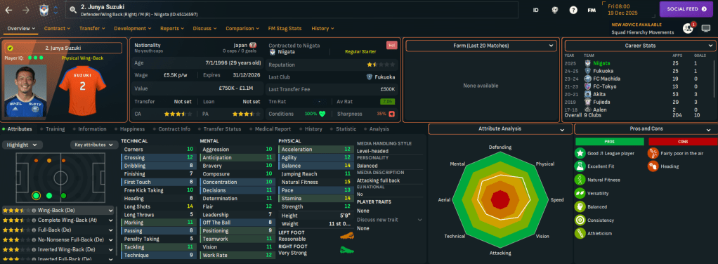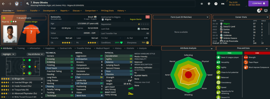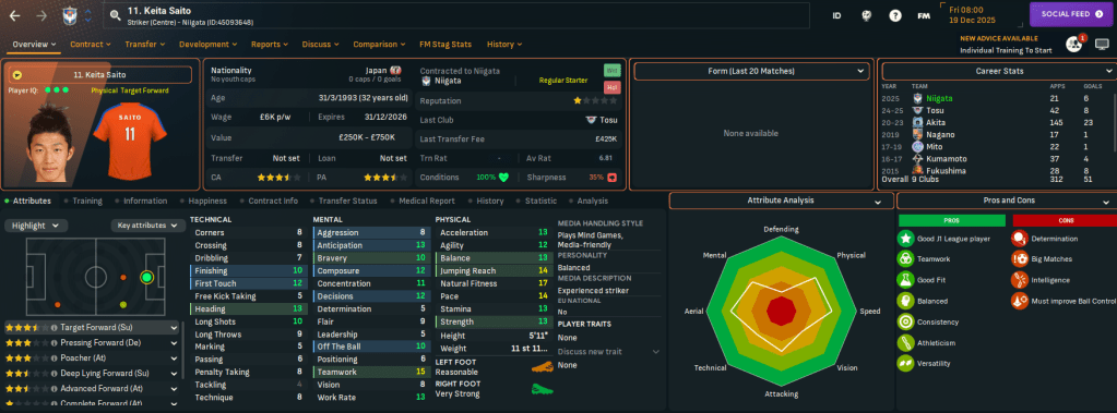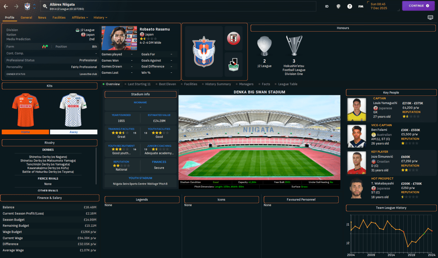 Niigata has two J2 League titles in 2003 and 2022 and, in this save, is currently in J2 League after relegation from J1 League in 2024. It finished below Rasamu’s Sanuki last season but represents a huge step up in stature. Indeed, Rasamu left a club struggling financially to one with £17.3m in the bank, a £15m transfer budget and a £126k weekly wage budget, which is over £100k more than at Sanuki.